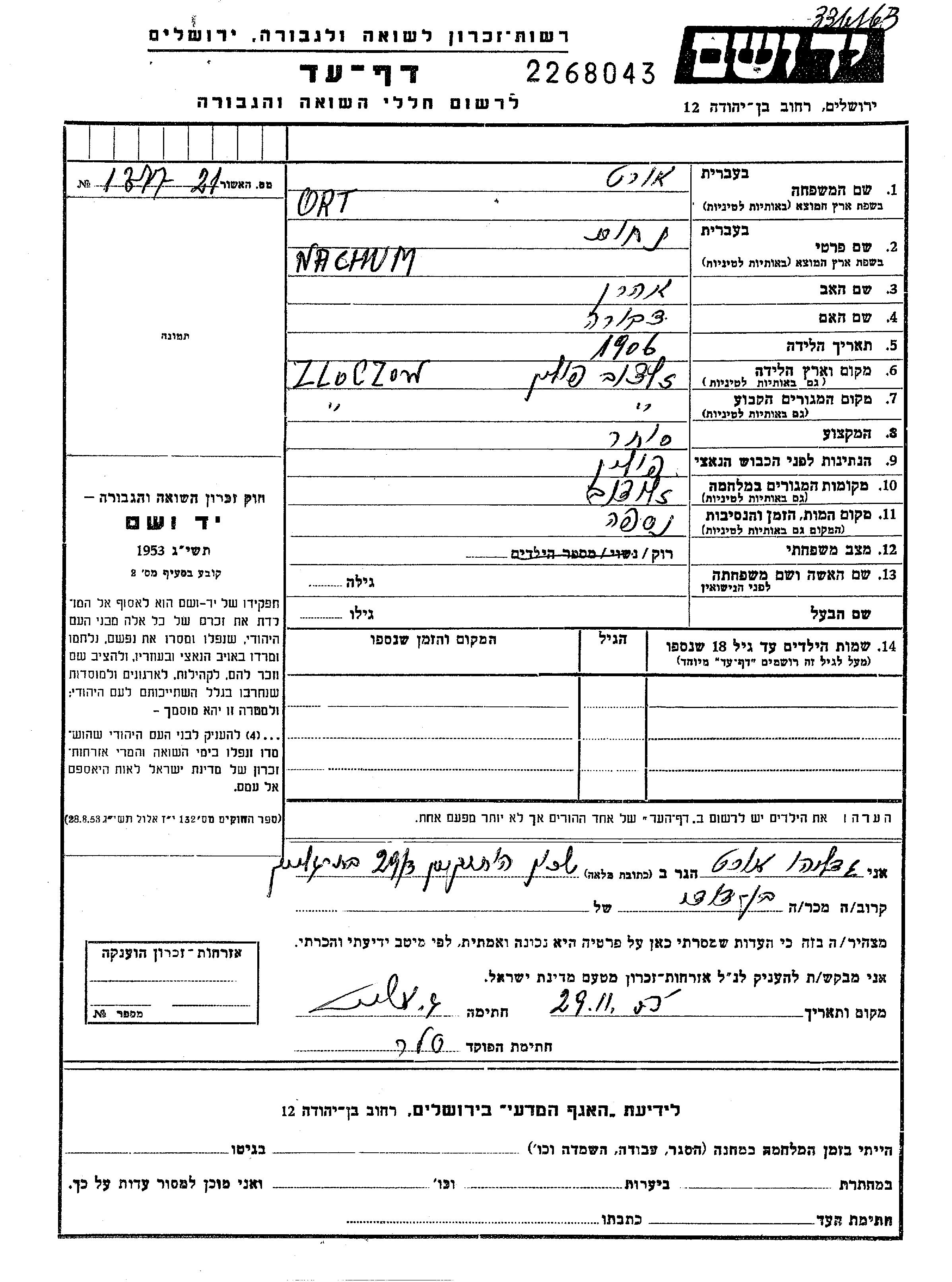 Ort Nachum 1906 Zloczow, Pologne Feuille de témoignage