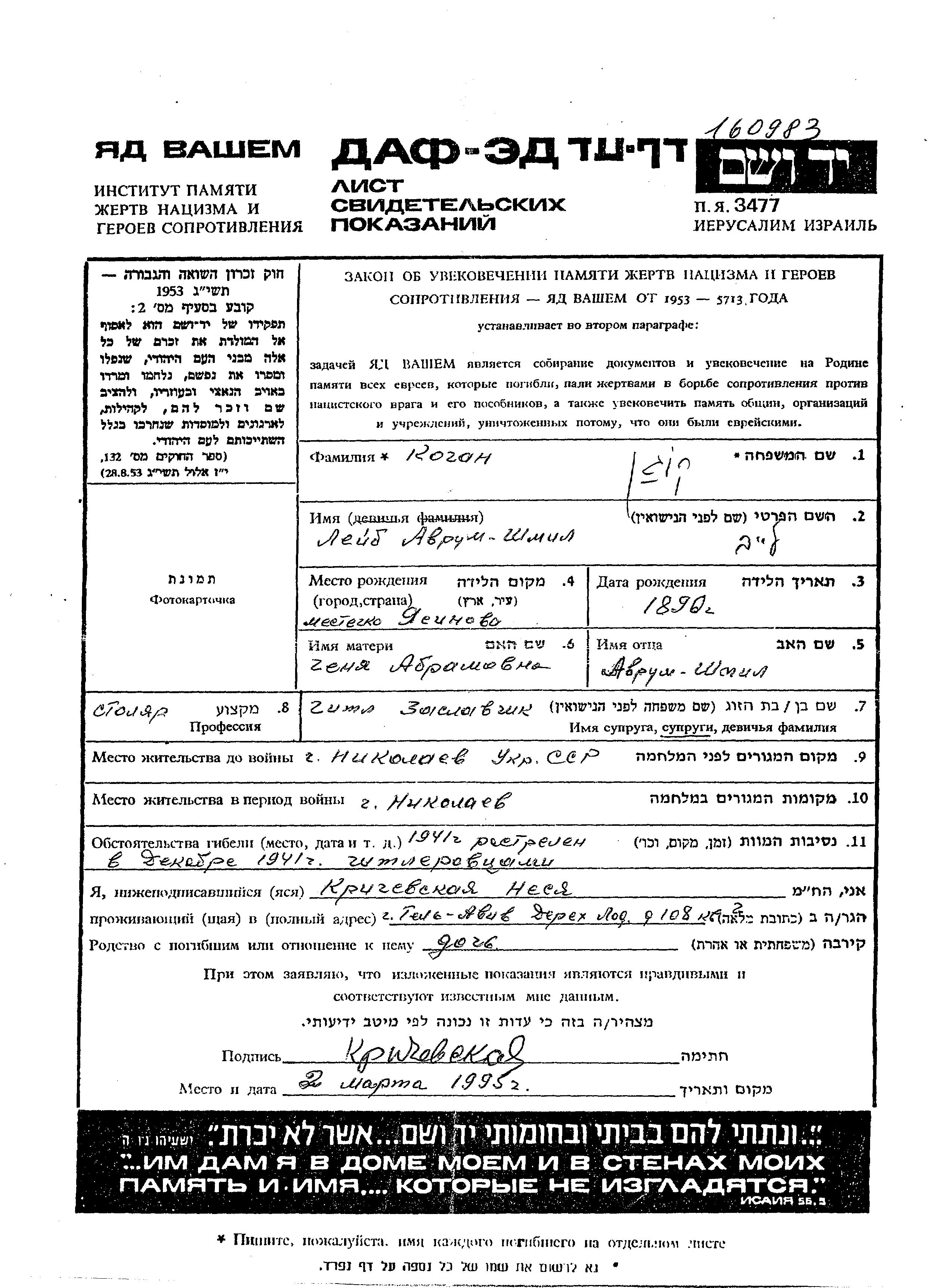 Kogan Leib 1890 Nikolayev, Ukraine (URSS) Feuille de témoignage