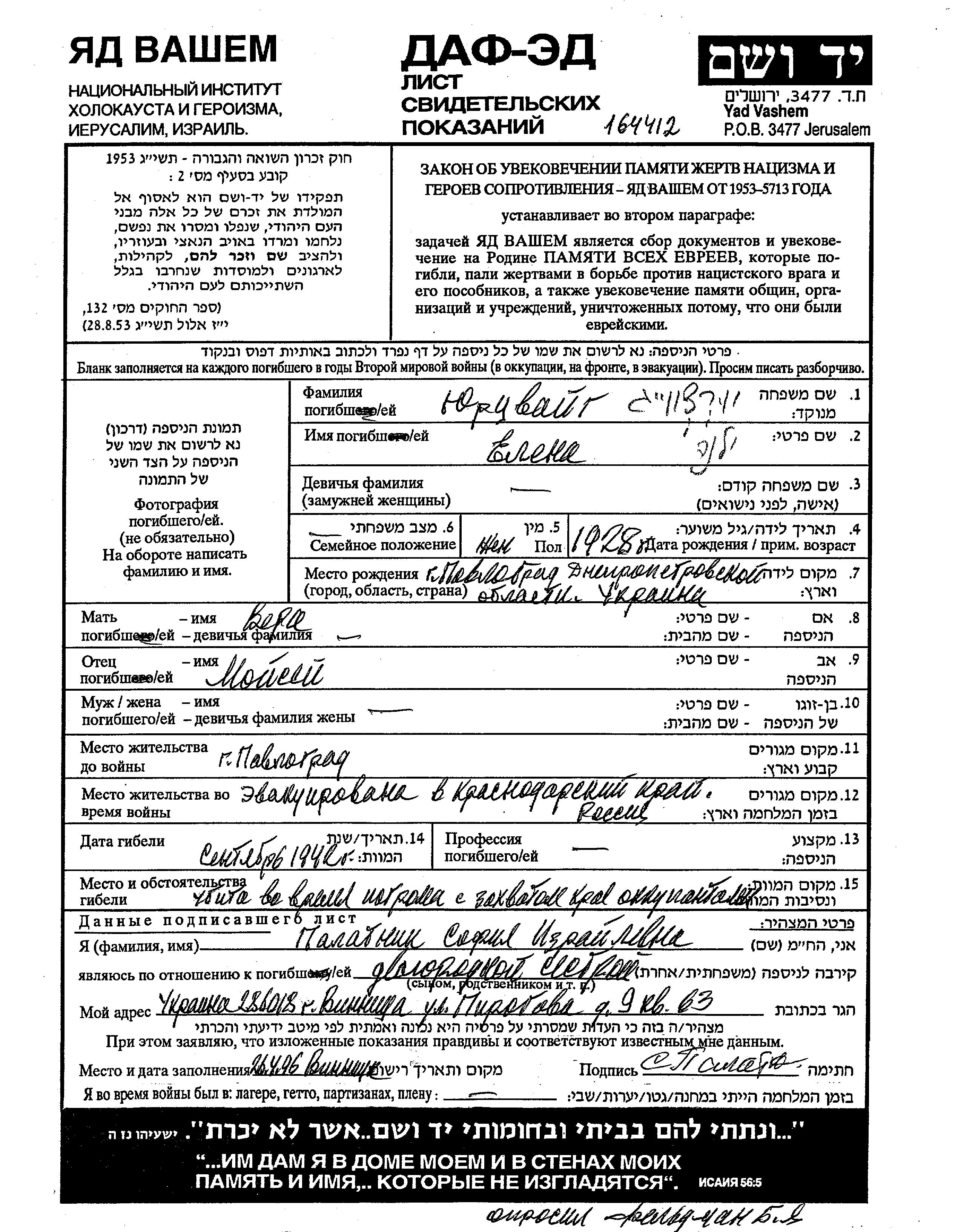 Yurtzvaig Yelena 1928 Pavlograd, Ukraine (URSS) Feuille de témoignage