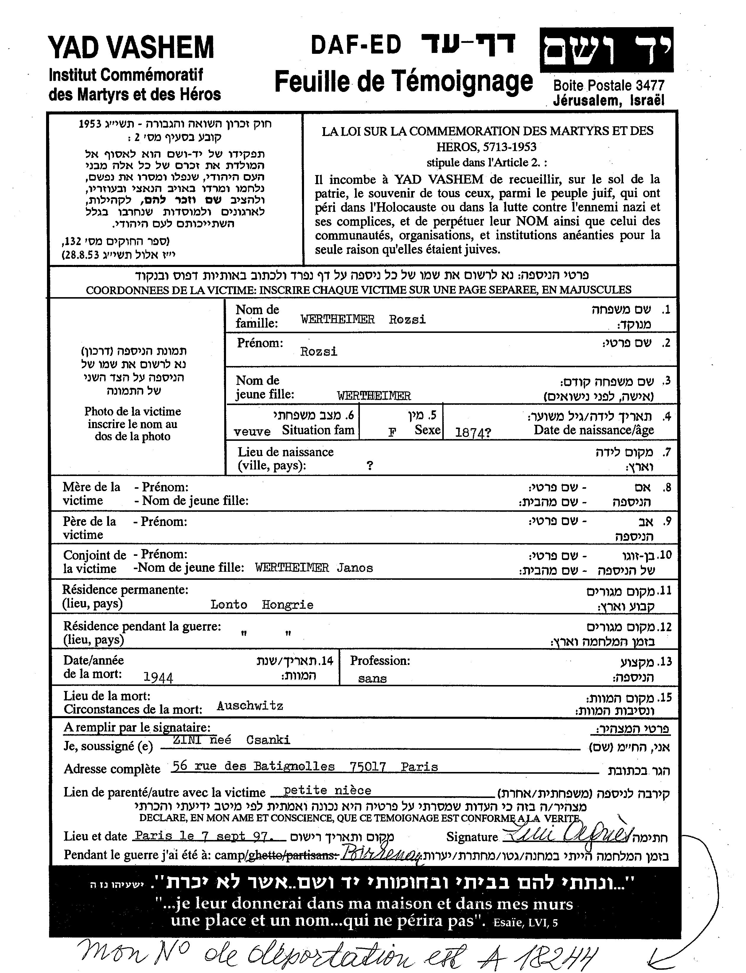 Wertheimer Rozsi 1874 Lonto, Tchécoslovaquie Feuille de témoignage