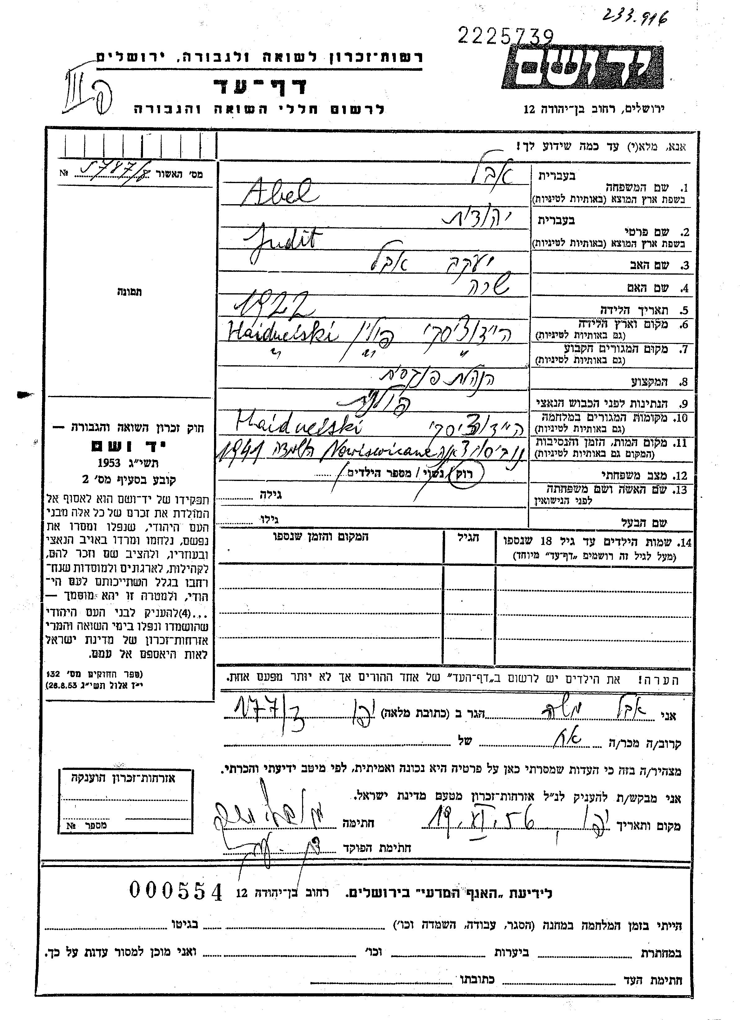 Abel Judit 1922 Hoduciszki, Pologne Feuille de témoignage