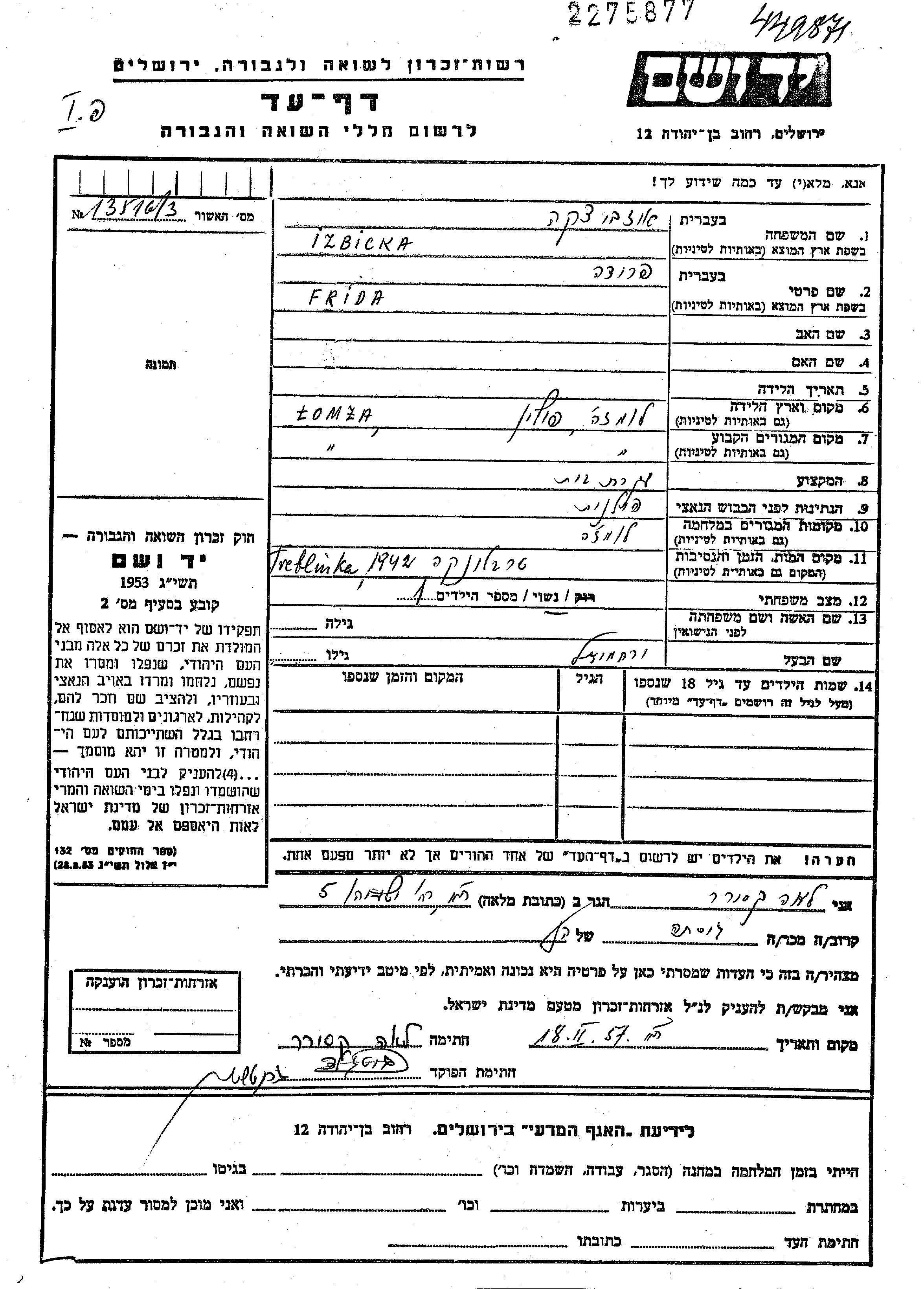 Izbicki Frida Łomża, Pologne Feuille de témoignage