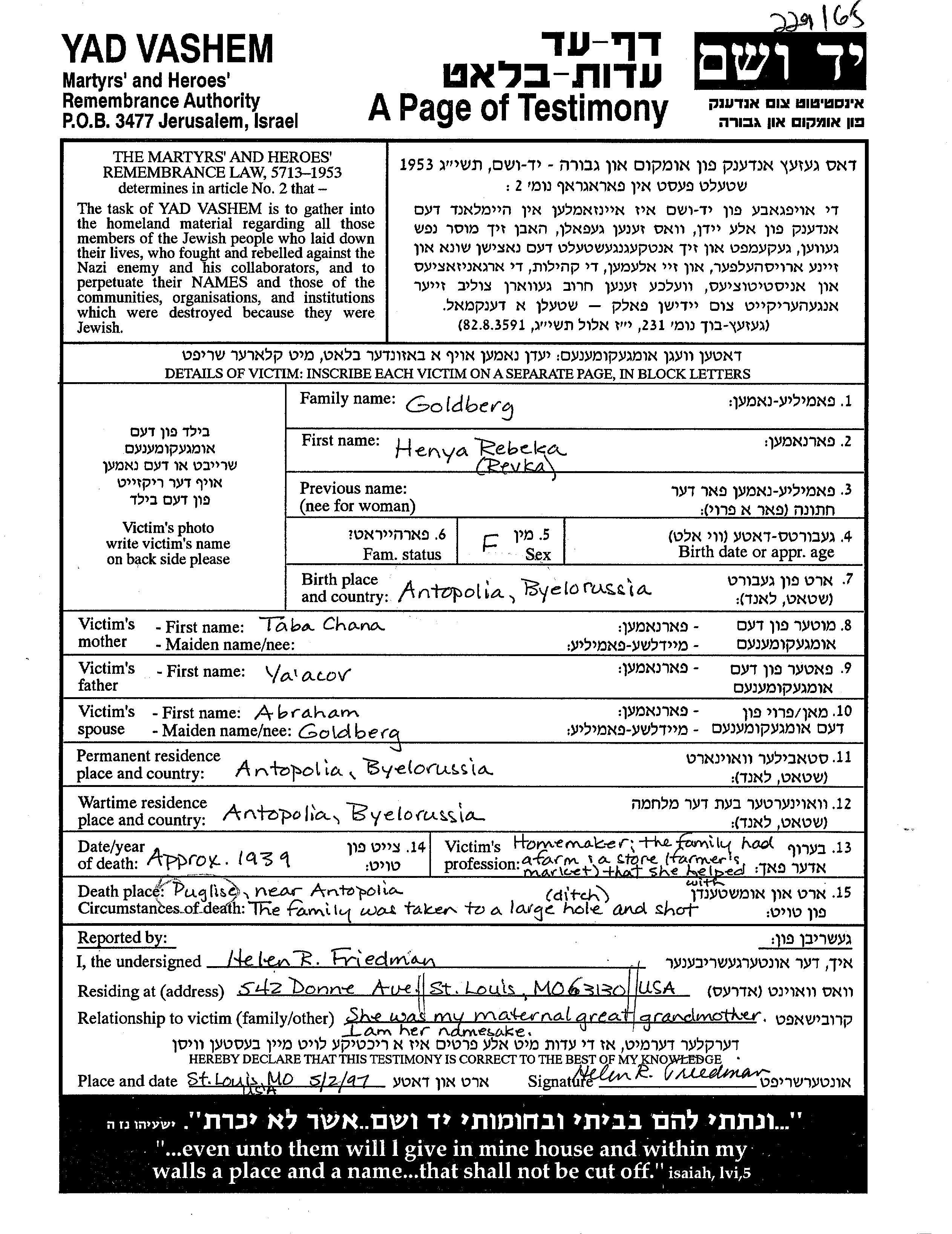 Goldberg Henya Rebeka endroit inconnu, Feuille de témoignage