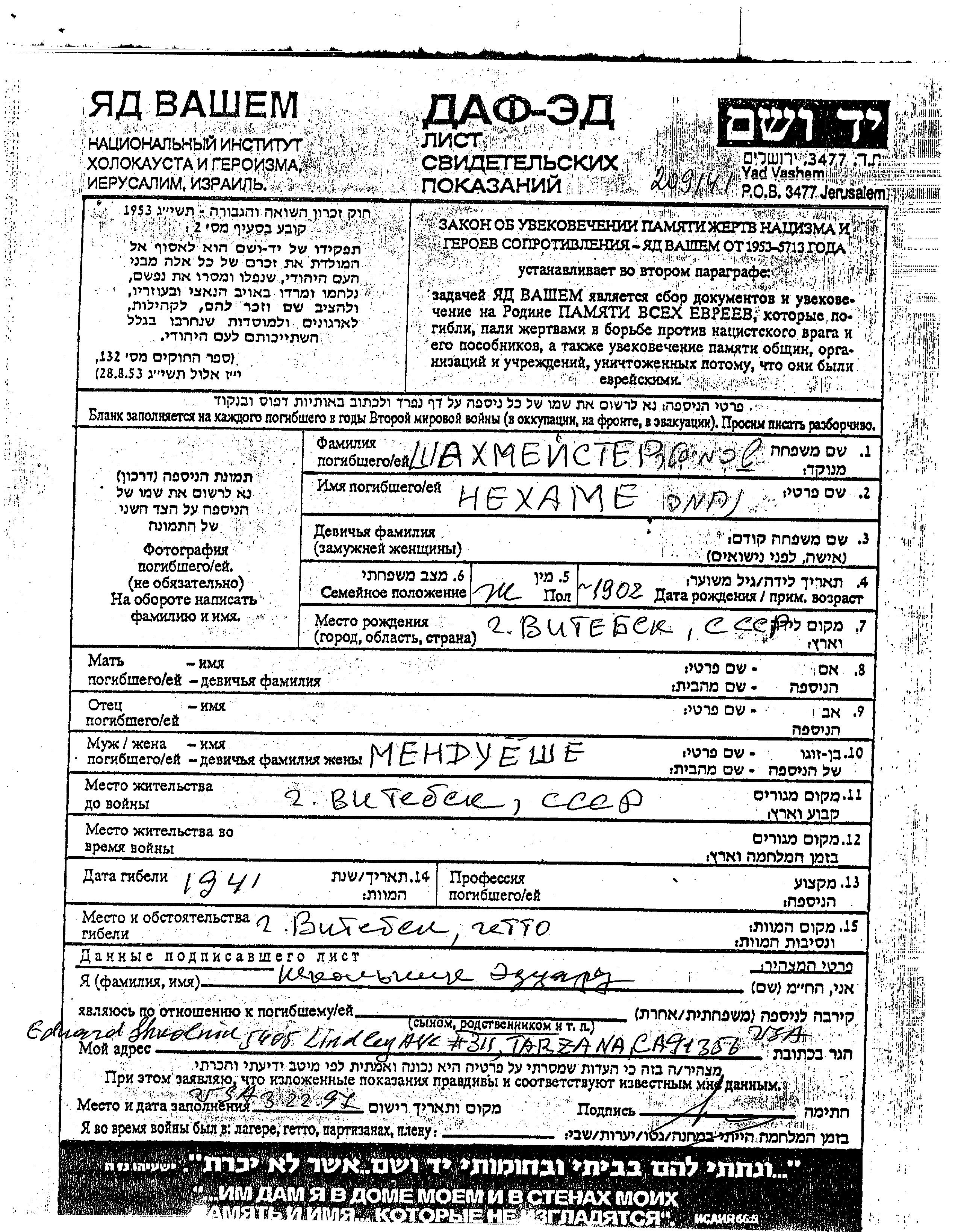 Shakhmeister Nekhame 1902 Vitebsk, Bélorussie (URSS) Feuille de témoignage