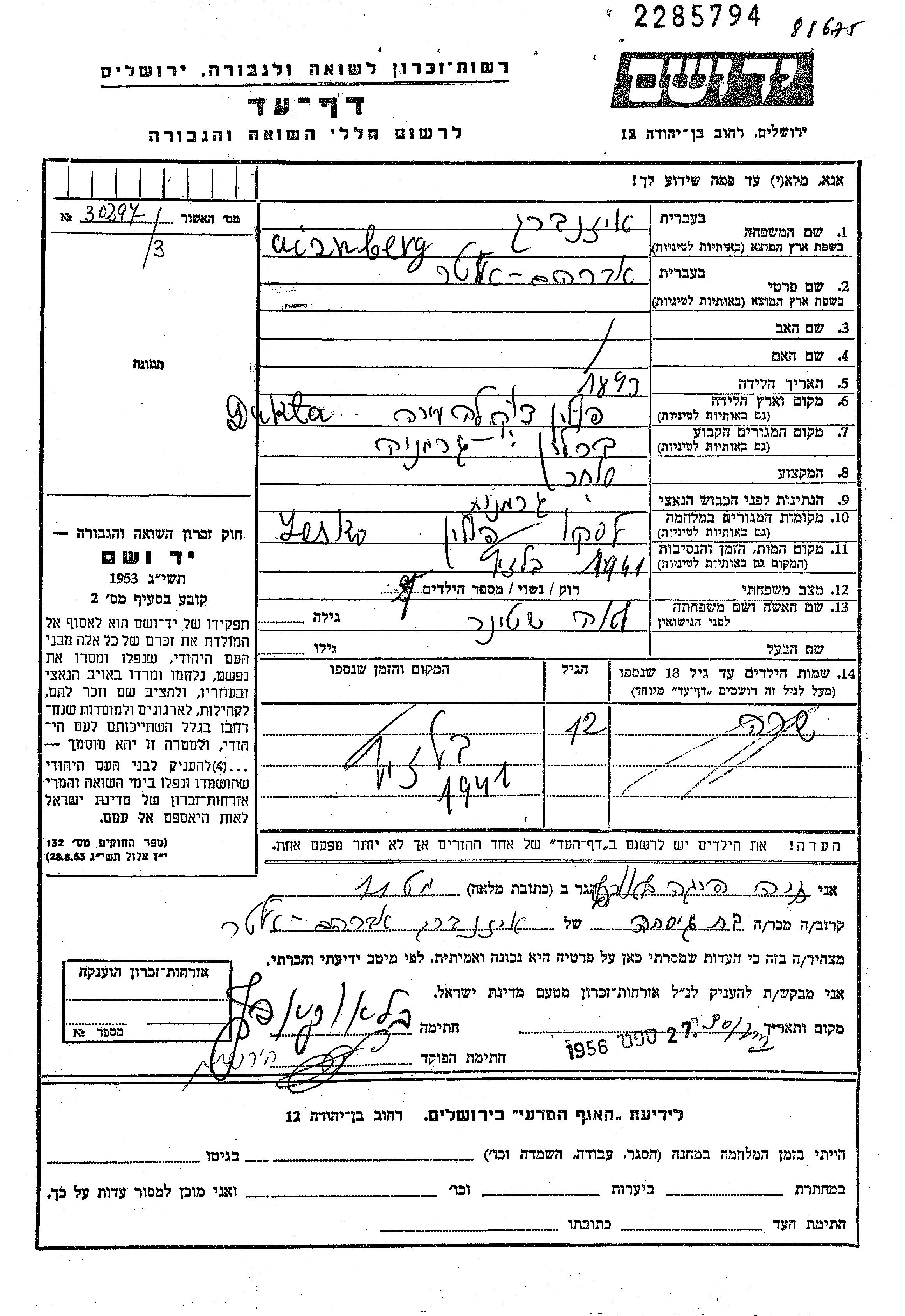 Aiznberg Avraham Alter 1893 Berlin, Allemagne Feuille de témoignage