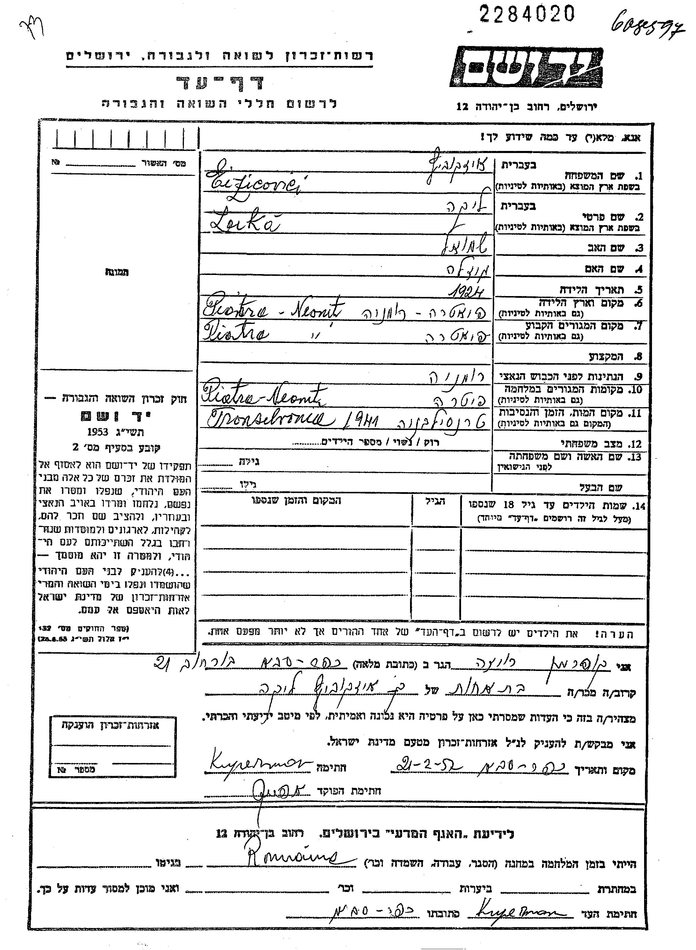 Eizicovici Leika 1924 Piatra Neamt, Roumanie Feuille de témoignage