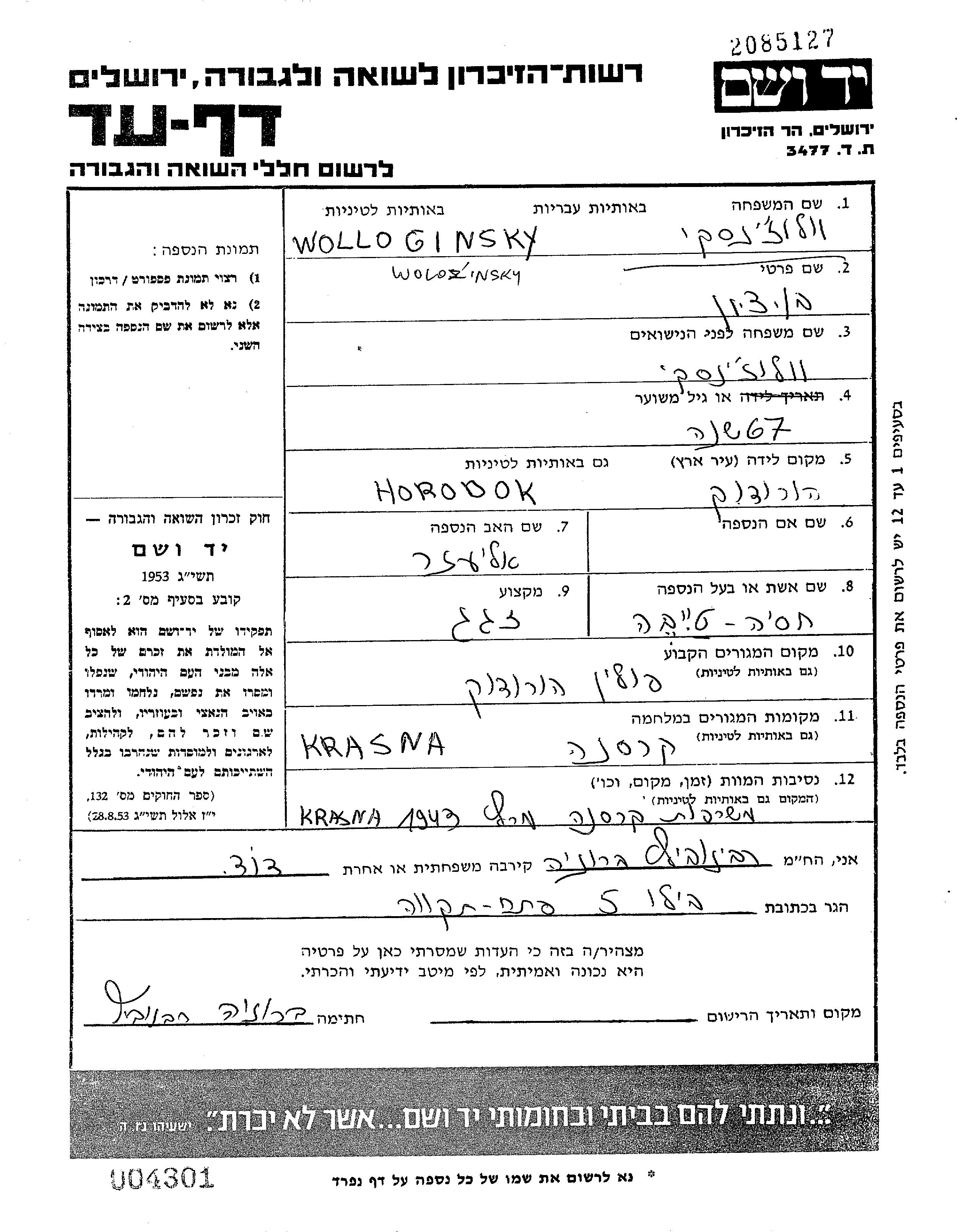 Bentzion Wolloginsky est né à Horodok, Pologne en 1876, fils de Eliezer. Il était Vitrier et Mariée à Khasia Taibe. Avant la seconde guerre mondiale il vivait à Horodok, Pologne. Au cours de la guerre, il était à Krasne, Pologne.