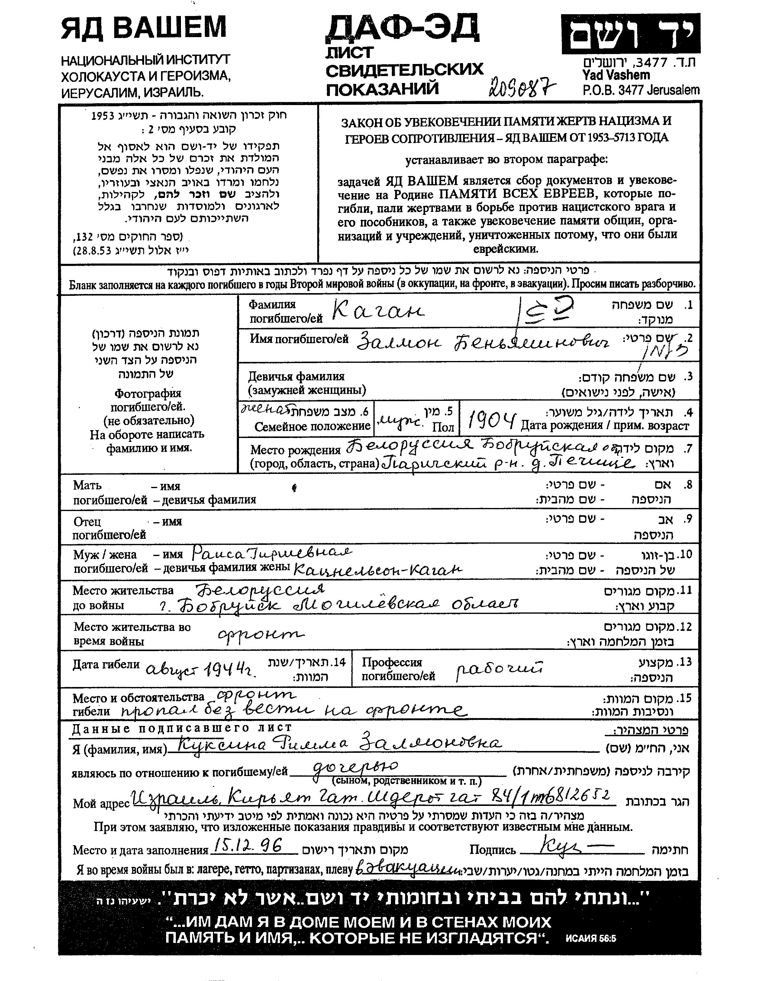 Kagan Zalman 1904 Bobruysk, Bélorussie (URSS) Feuille de témoignage
