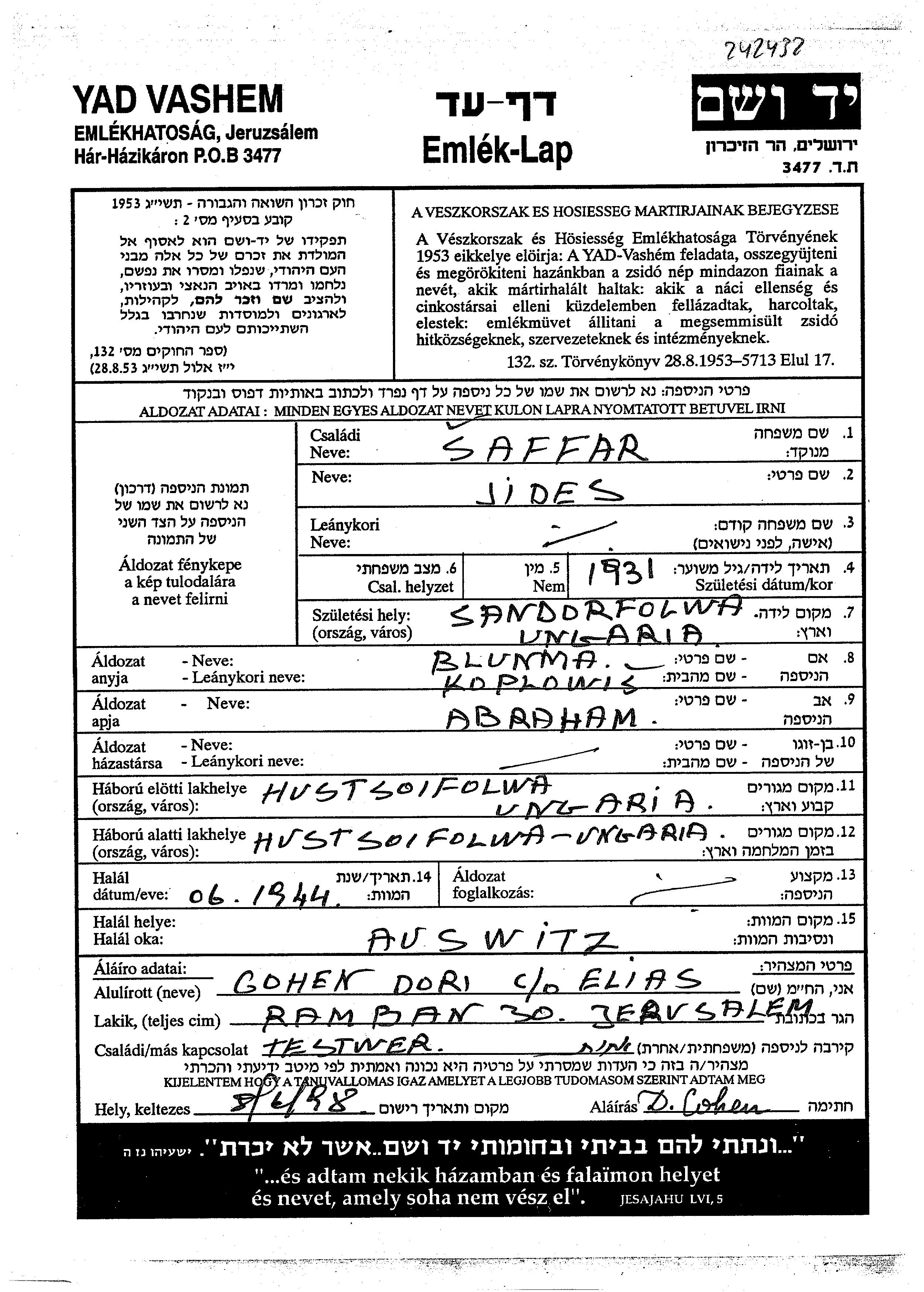 Saffar Shefer Jides 1931 Hust, Tchécoslovaquie Feuille de témoignage