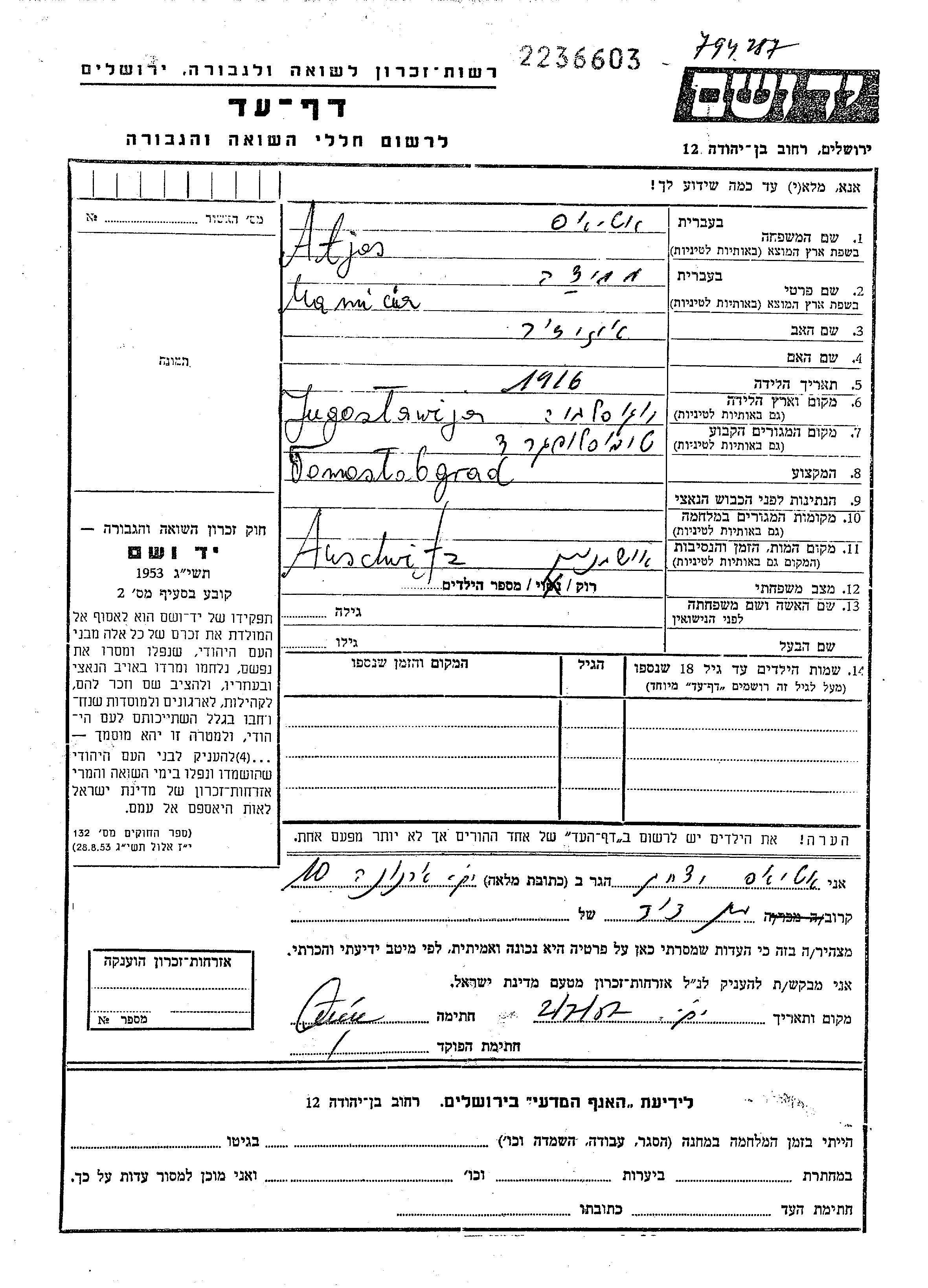 Yad Vashem - Pages of Testimony Names Memorial Collection