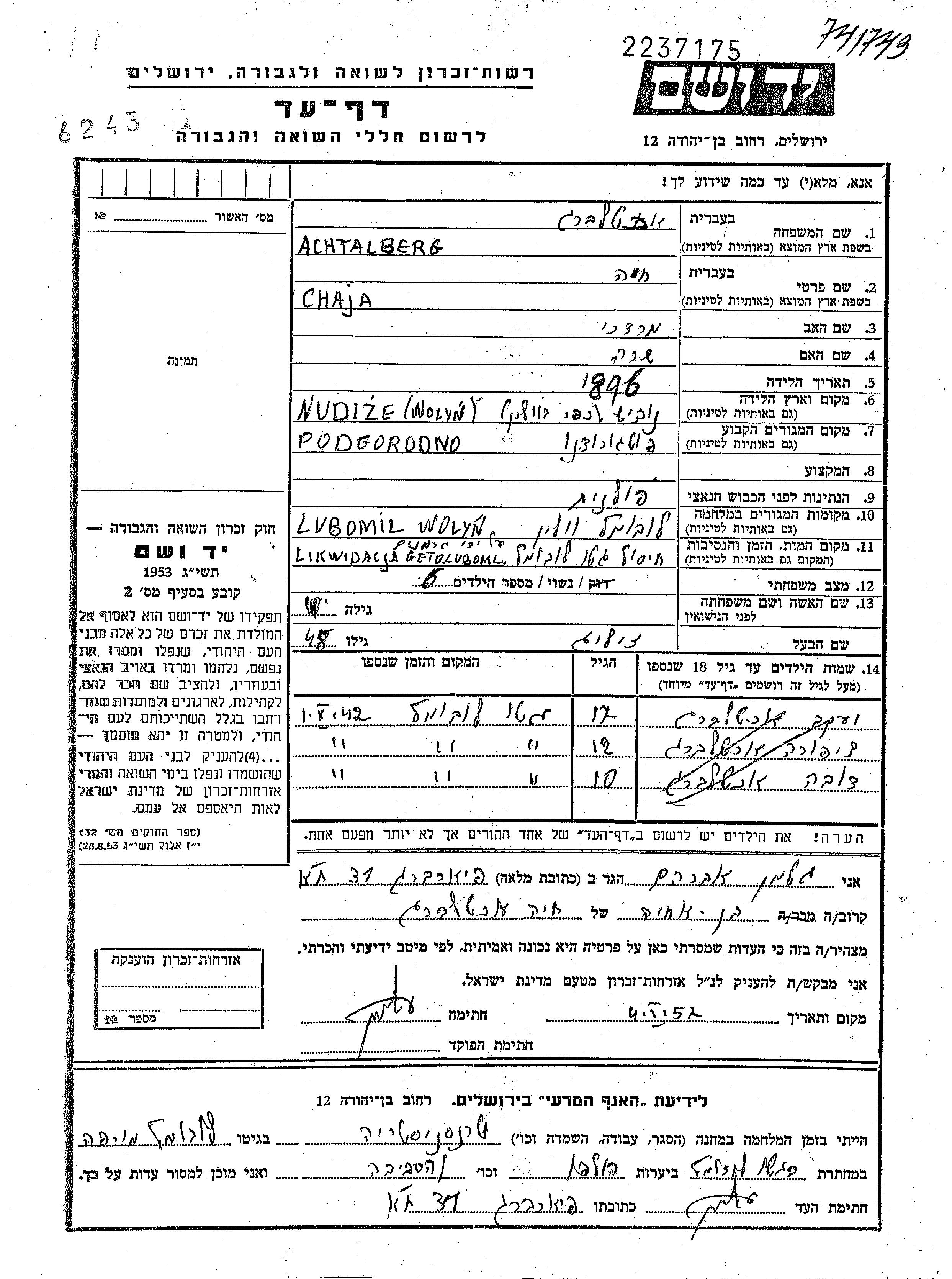 Achtalberg Chaja 1896 Podhorodno, Pologne Feuille de témoignage