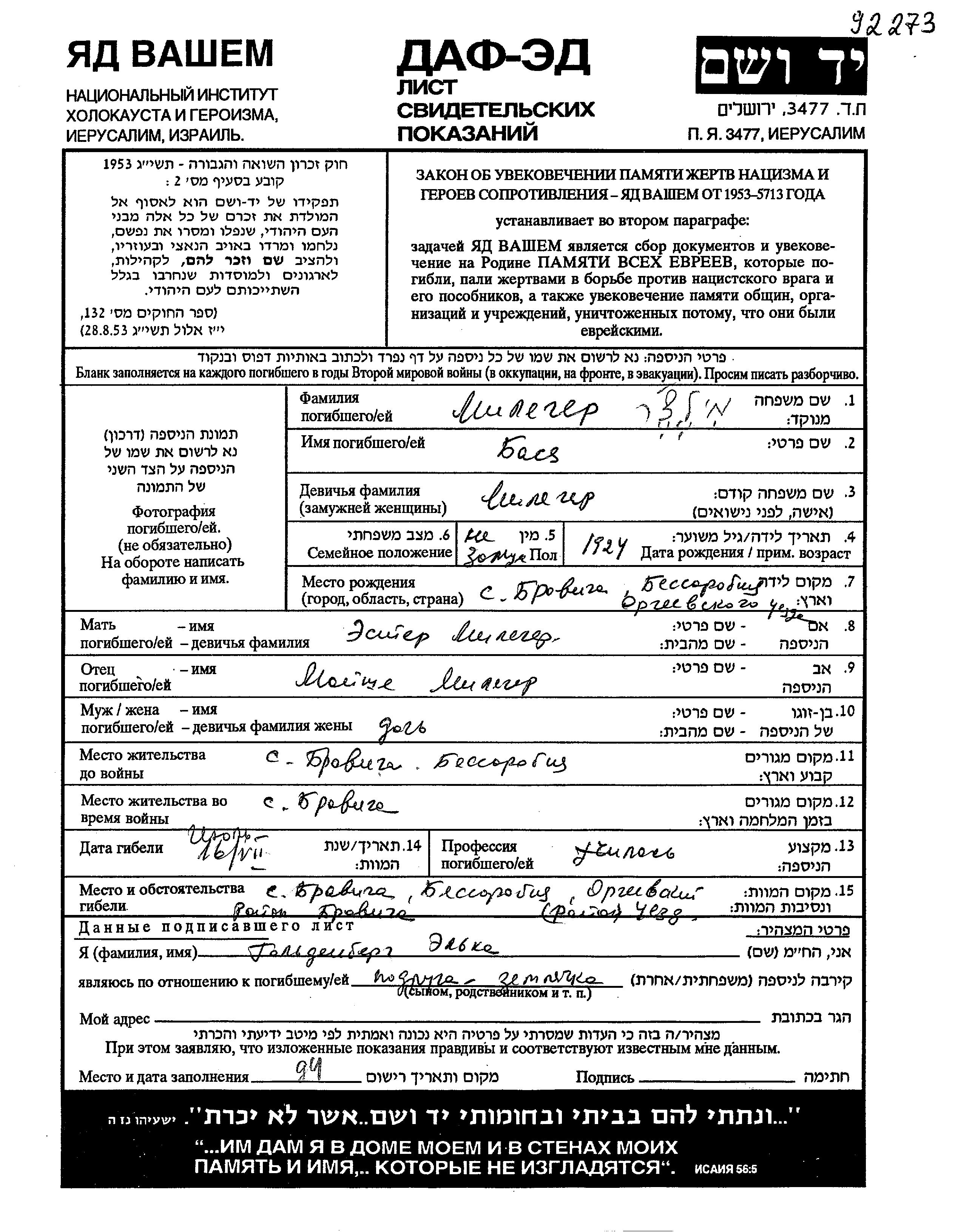 Yad Vashem - Pages of Testimony Names Memorial Collection