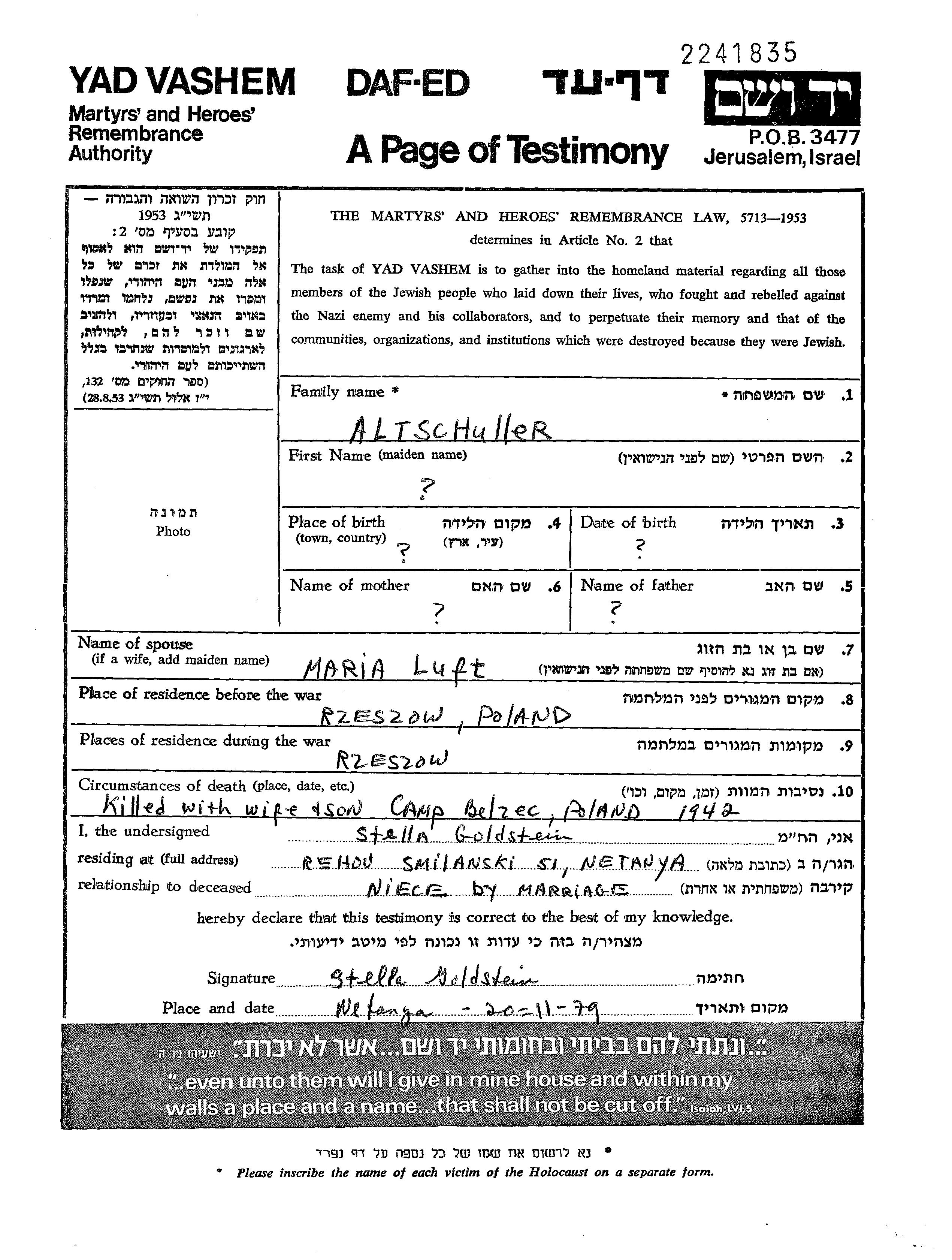 Lieu de résidence pendant la guerre/Shoah