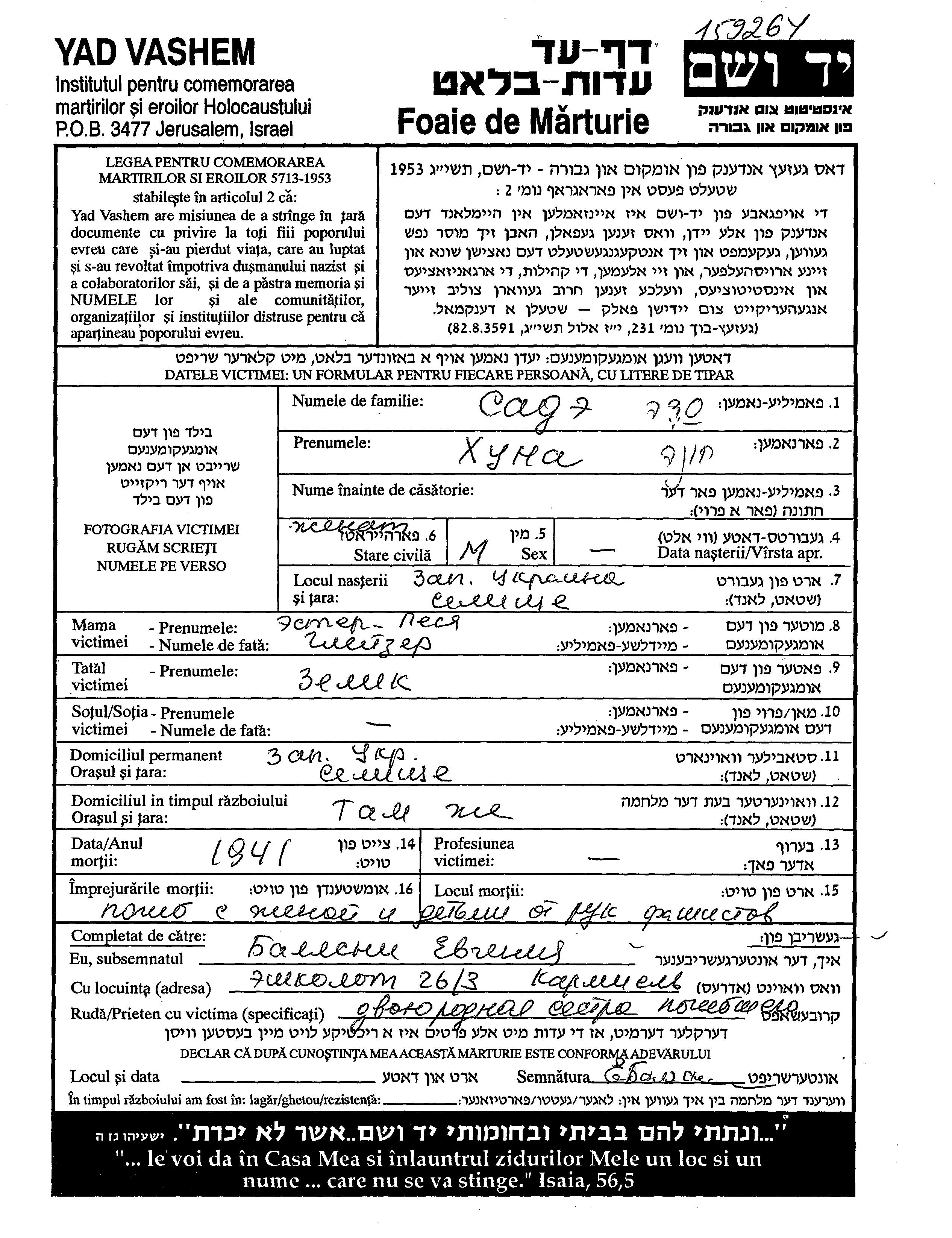 Yad Vashem - Pages of Testimony Names Memorial Collection