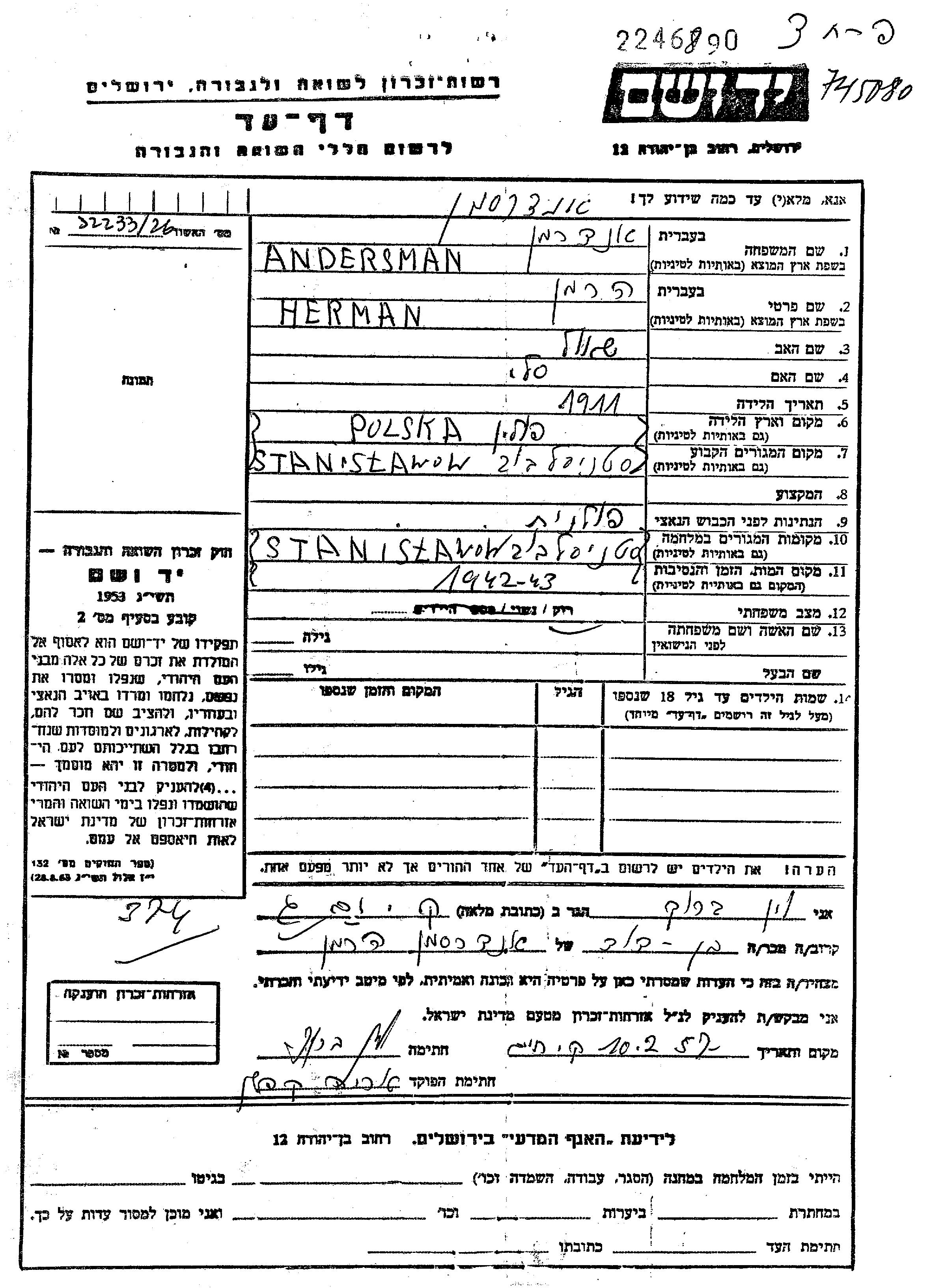 Herman Andersman Anderman est né à Stanislawow, Pologne en 1911, fils de Szaul et de Sali née Vin. Il était Célibataire. Avant la seconde guerre mondiale il vivait à Pinsk, Pologne. Au cours de la guerre, il était à Pinsk, Pologne.