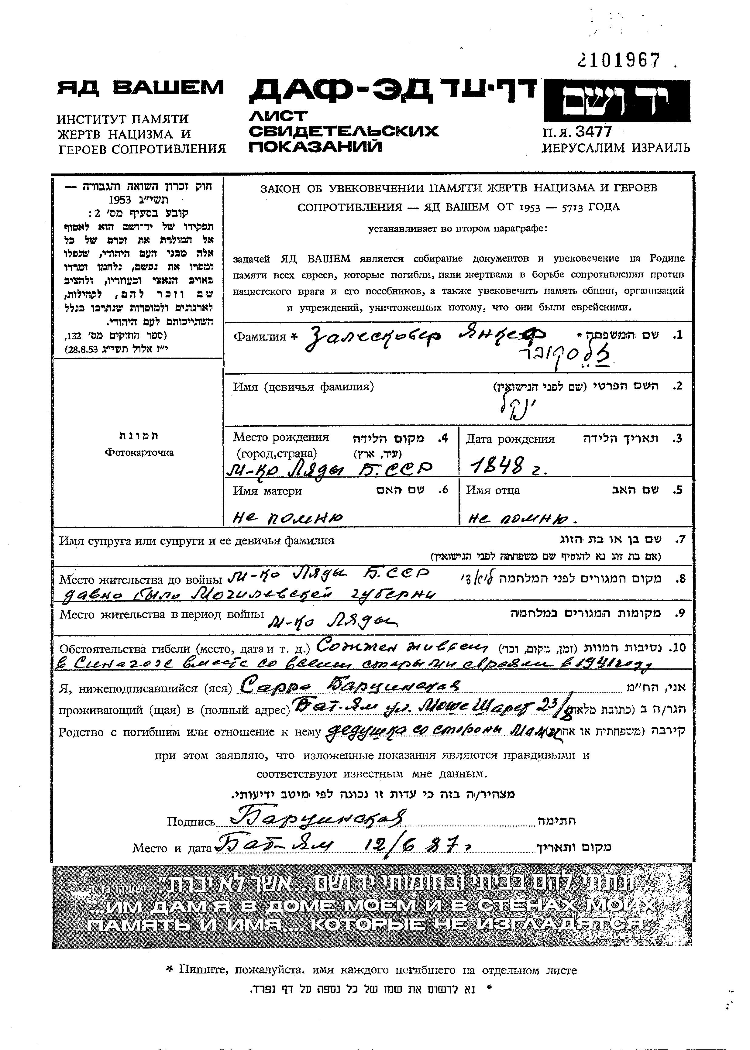Zaleskover Yankef 1848 Lyady, Bélorussie (URSS) Feuille de témoignage