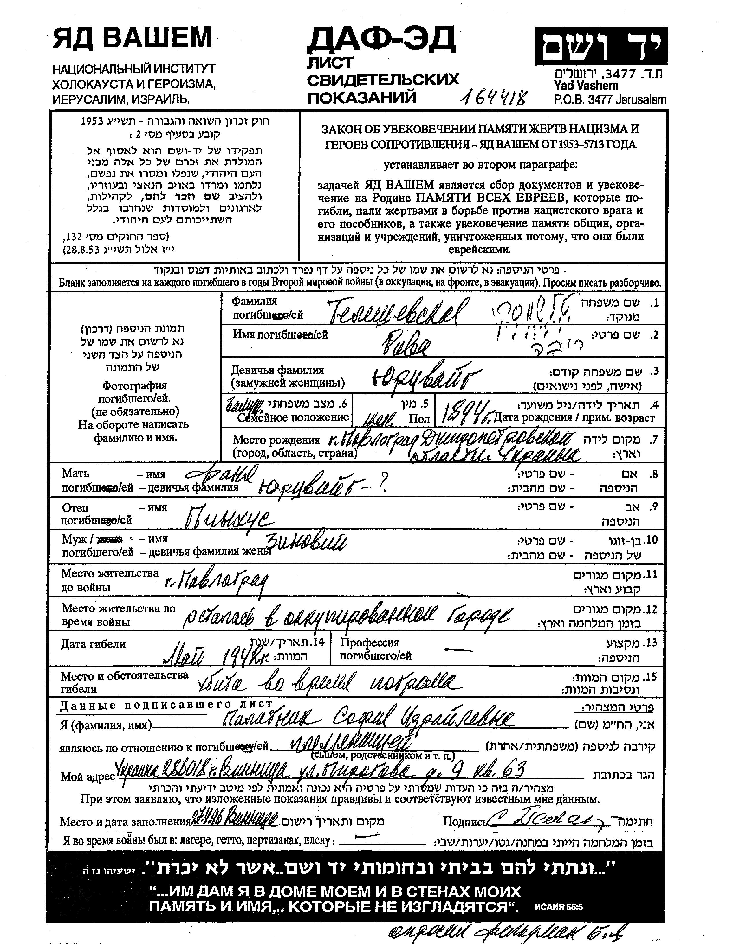 Yad Vashem - Pages of Testimony Names Memorial Collection