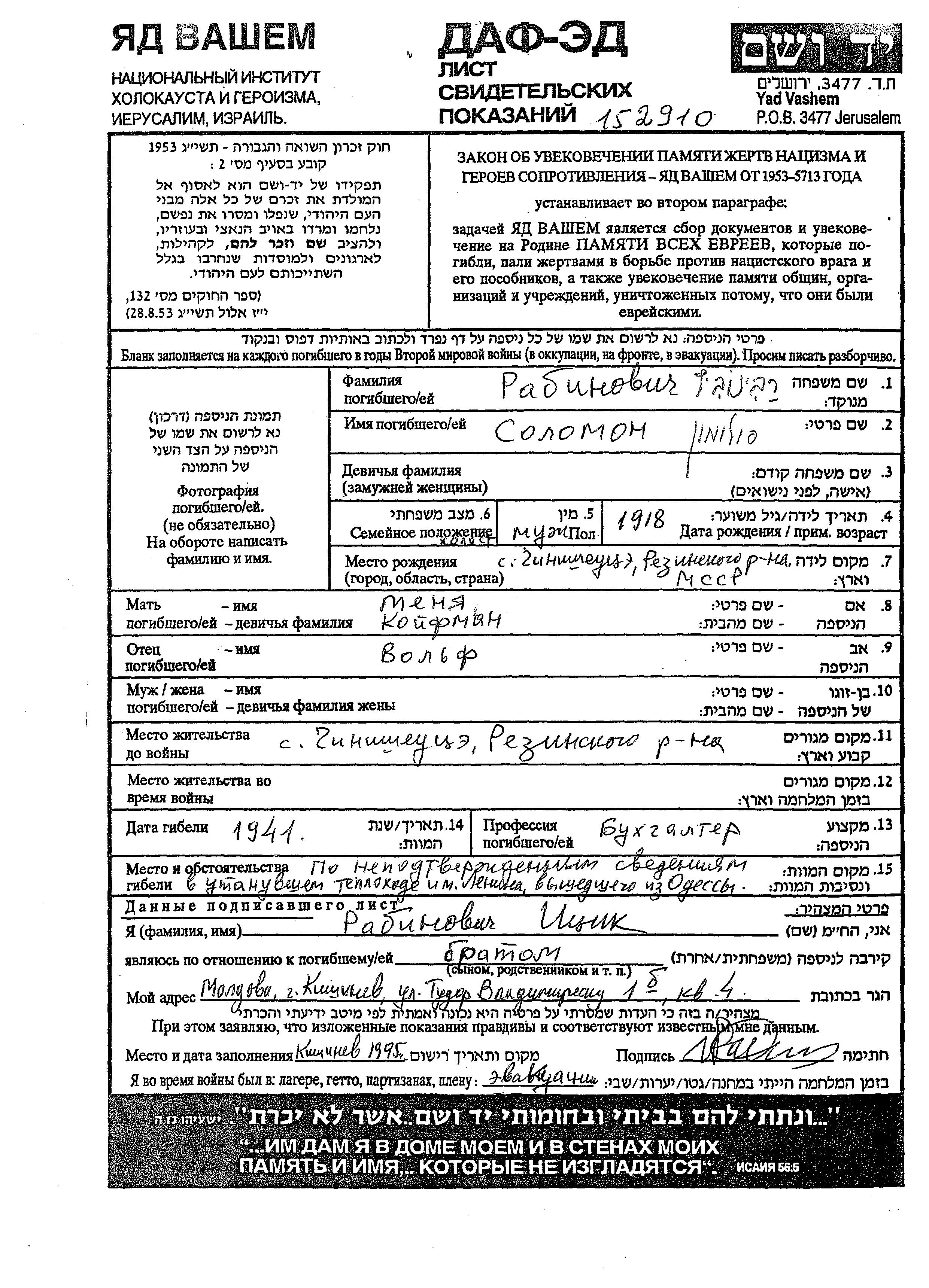 Solomon Rabinovich est né à Ciniseuti, Roumanie en 1918, fils de Volf et de Menia Mania née Koifman. Il était Comptable et Célibataire. Avant la seconde guerre mondiale il vivait à Ciniseuti, Roumanie. Au cours de la guerre, il était à Odessa, Ukraine (URSS).