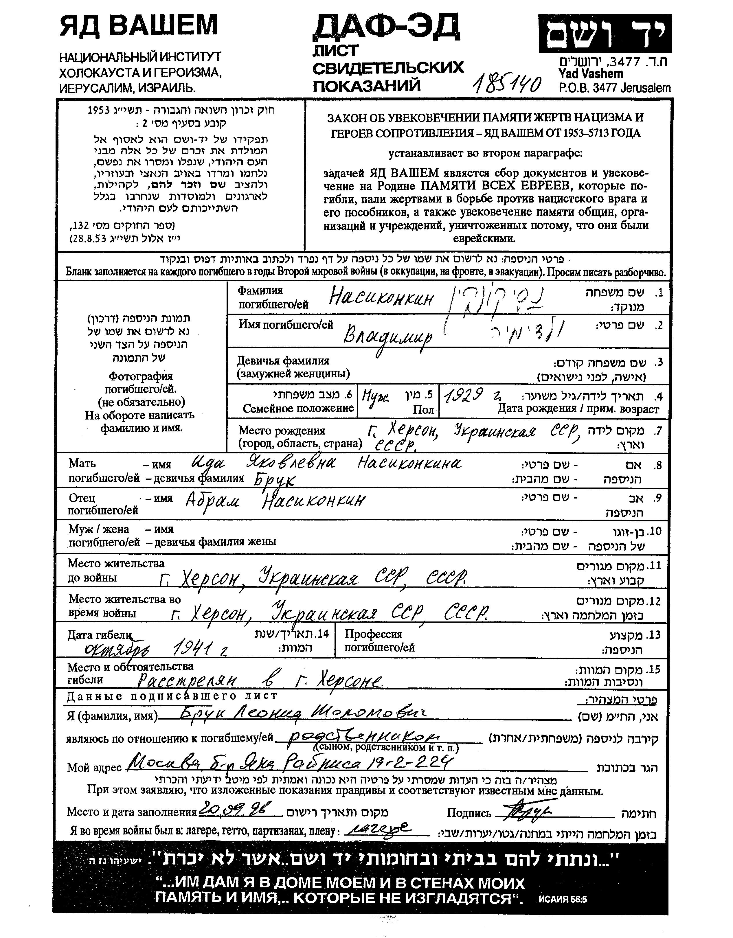 Nasikonkin Vladimir 1929 Kherson, Ukraine (URSS) Feuille de témoignage