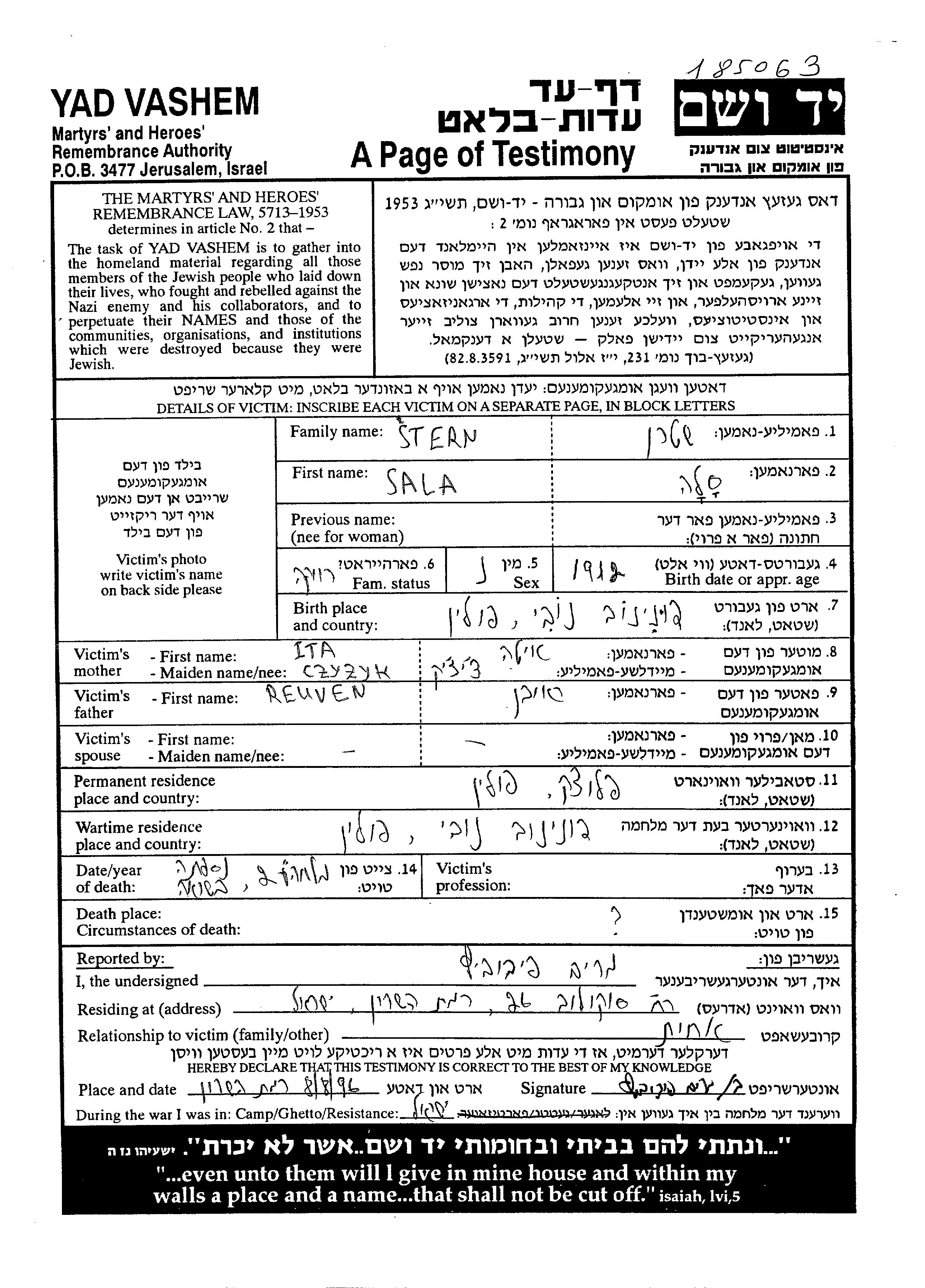 Sala Stern est née à Duninow Nowy, Pologne en 1912, fille de Reuven et de Ita née Czyzyk. Elle était Célibataire. Avant la seconde guerre mondiale elle vivait à Plock, Pologne. Pendant la guerre, elle était à Duninow Nowy, Pologne.