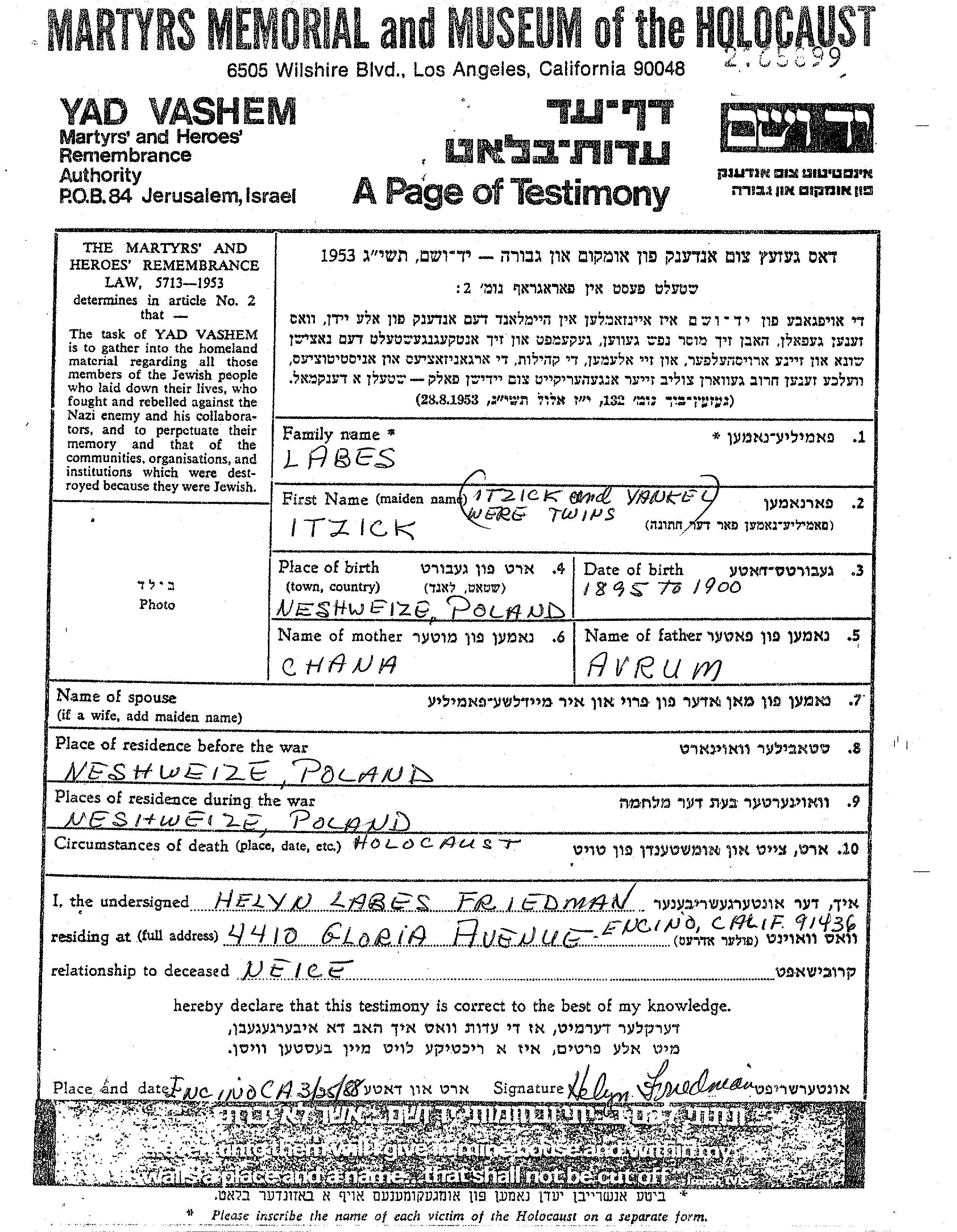 Labes Itzick 1895 Nieśwież, Pologne Feuille de témoignage