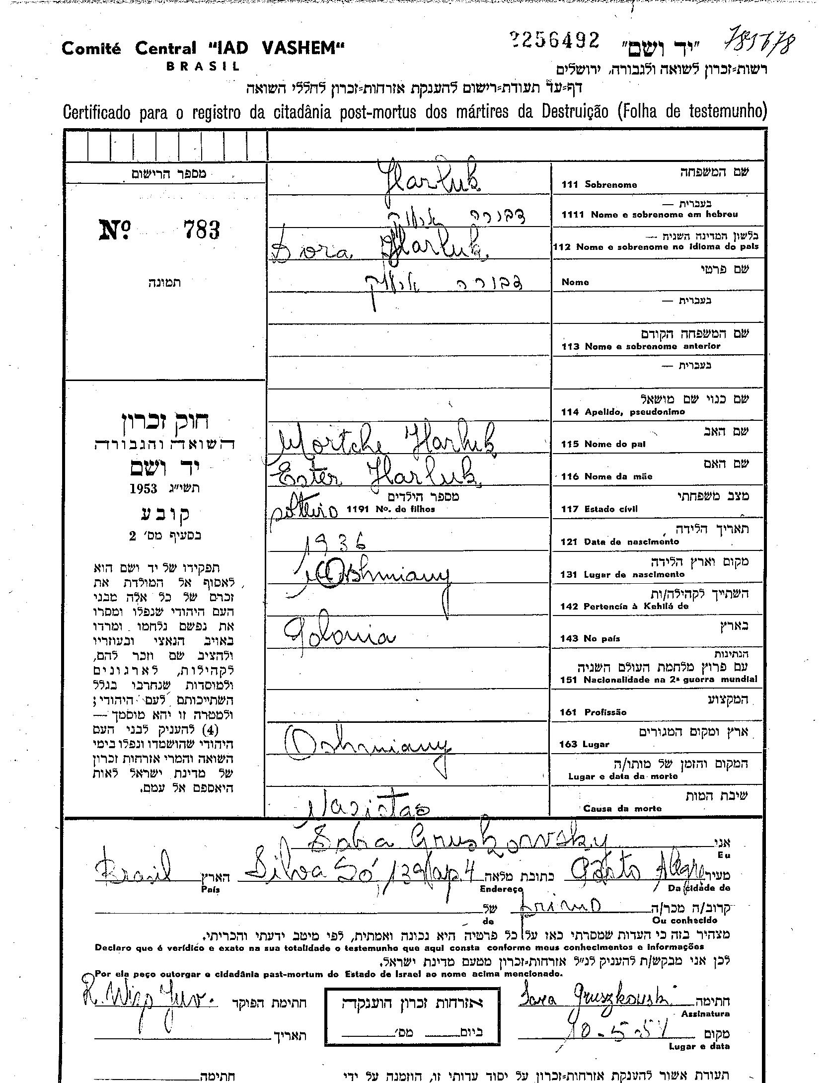 Dora Dvora Harluk est née à Oszmiana, Pologne en 1936, fille de Mortche et de Ester née Bunianer. Elle était Enfant. Avant la seconde guerre mondiale elle vivait à Oszmiana, Pologne. Pendant la guerre, elle était à Oszmiana, Pologne.