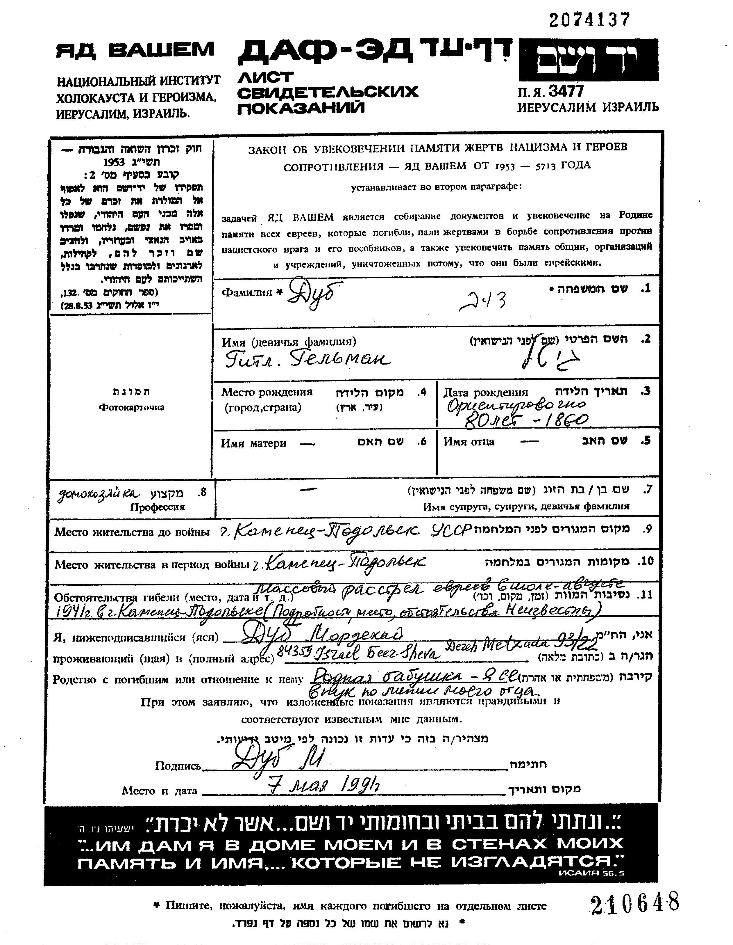 Dub Dov Gitl 1860 Kamenets Podolskiy, Ukraine (URSS) Feuille de témoignage