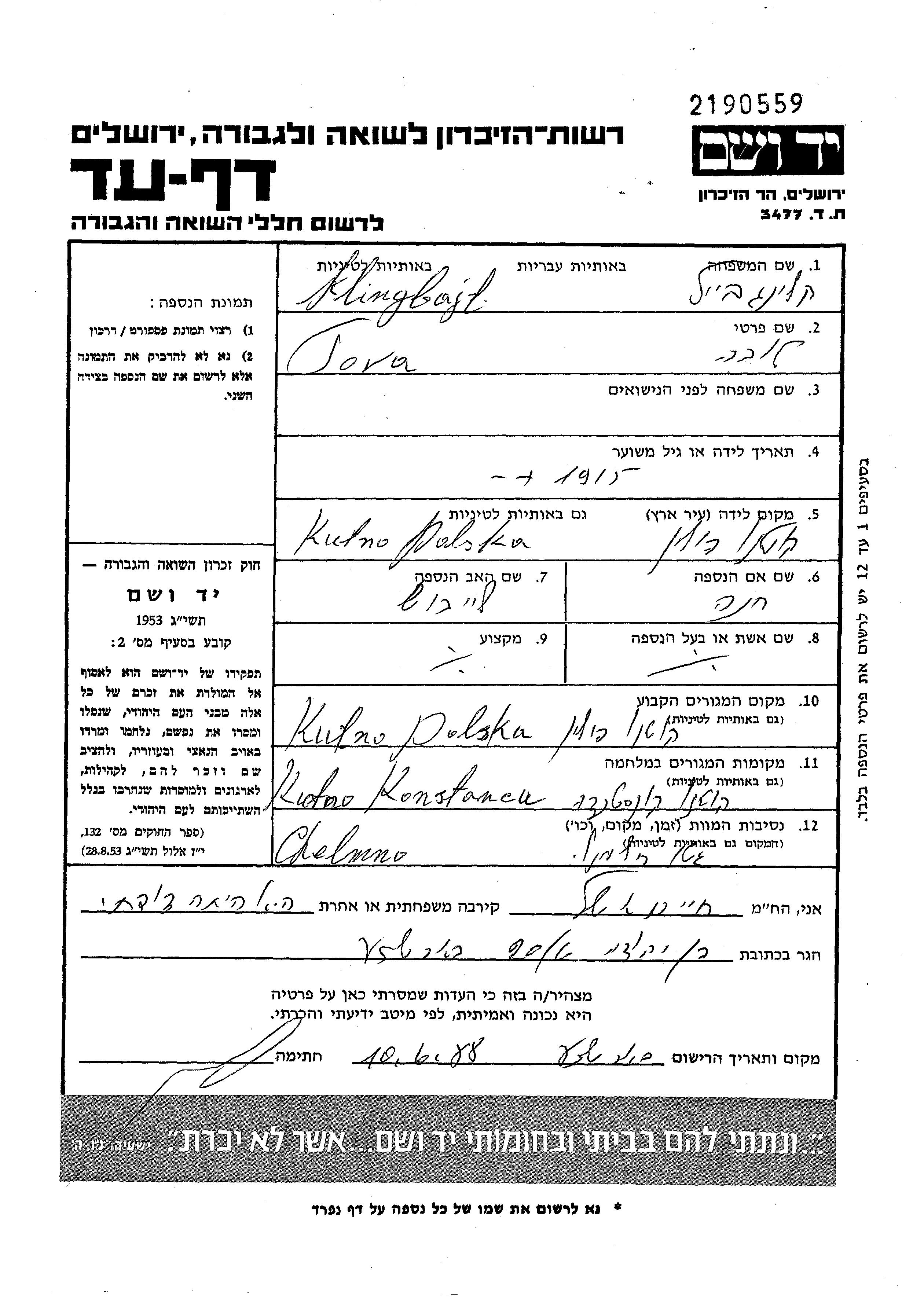 Klingbajl Tova 1915 Kutno, Pologne Feuille de témoignage