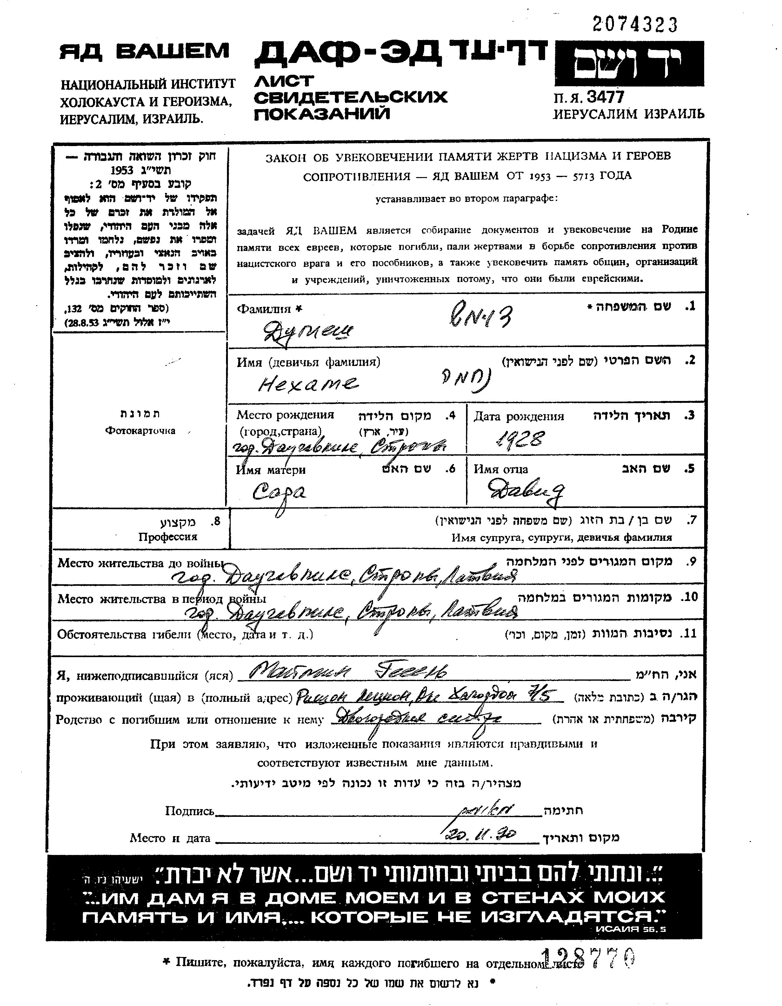 Dumesh Nekhame 1928 Daugavpils, Lettonie Feuille de témoignage