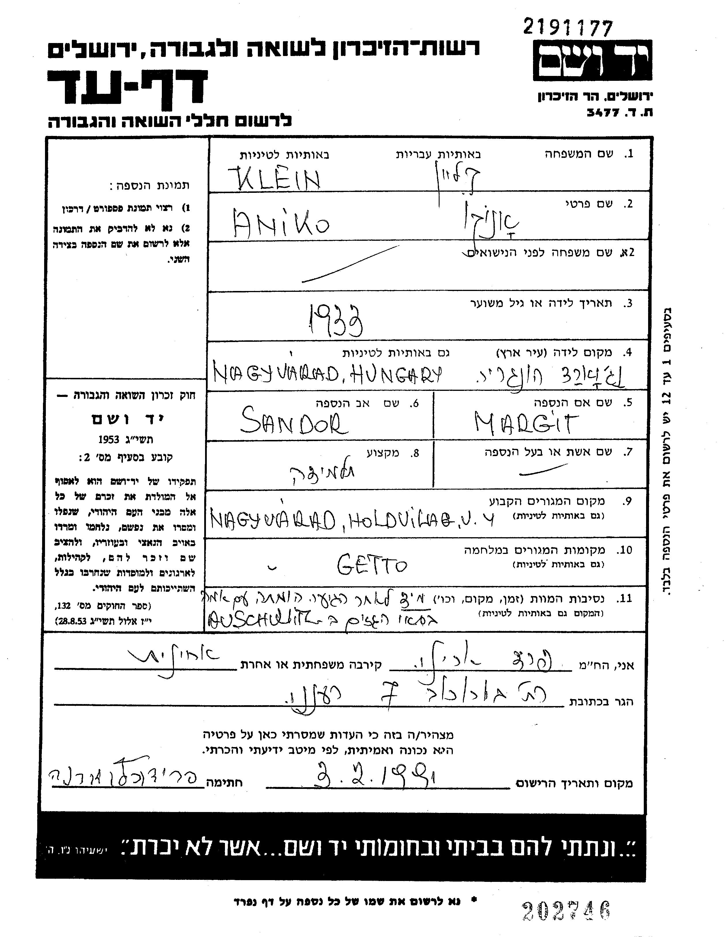 Klein Aniko 1933 Nagyvarad, Roumanie Feuille de témoignage