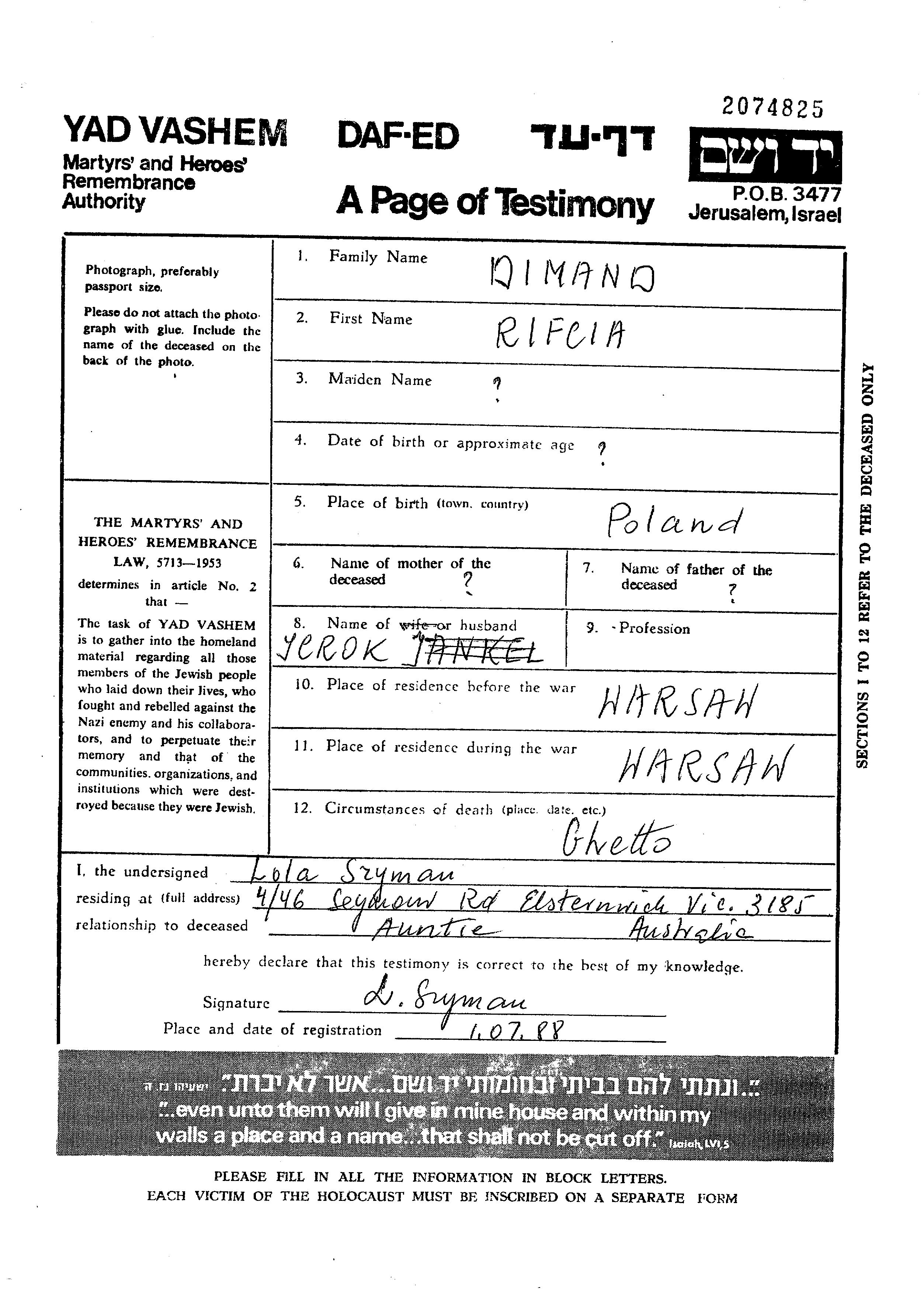 Dimand Ryfcia Warszawa, Pologne Feuille de témoignage