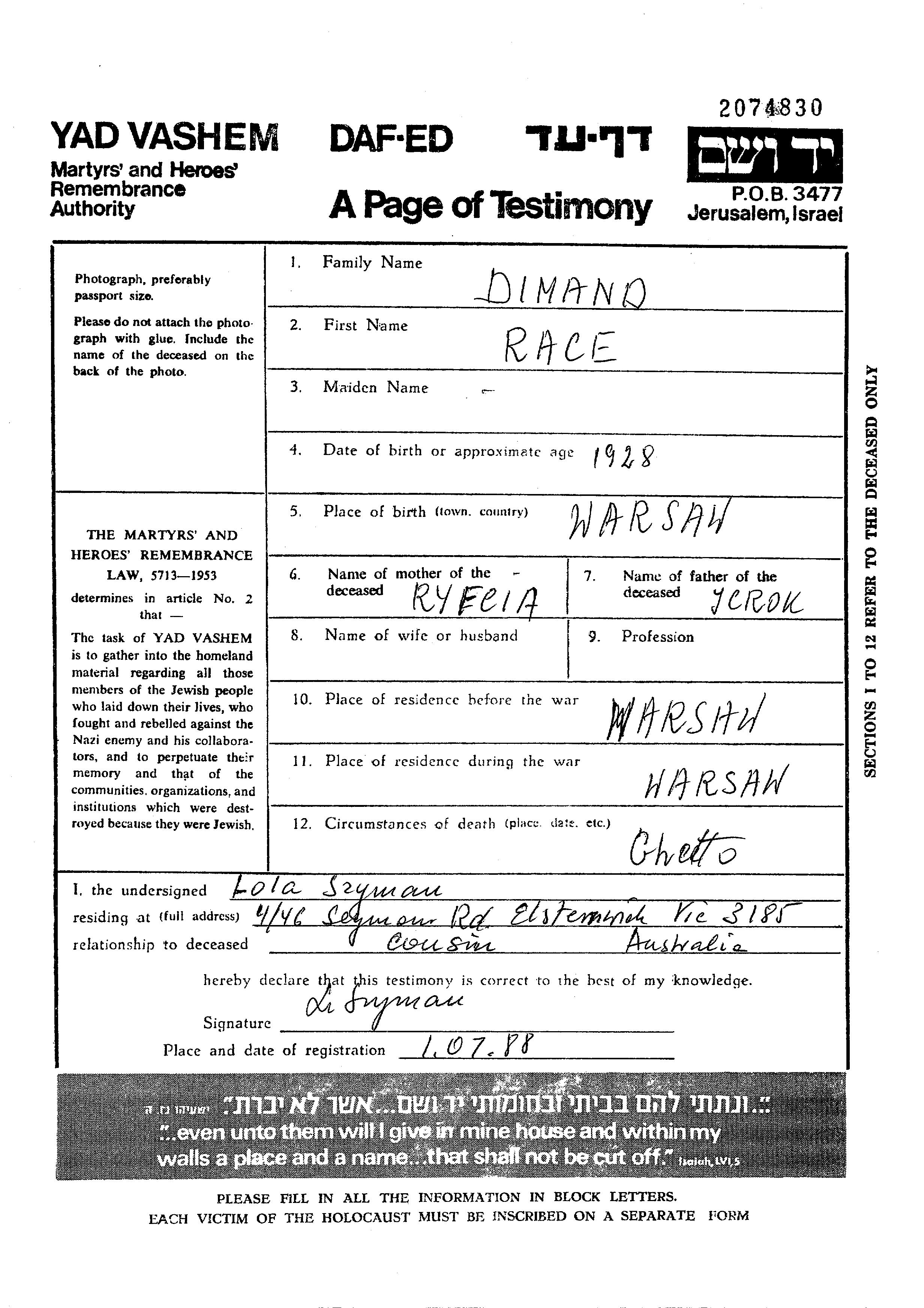 Race Dimand est née à Warszawa, Pologne, fille de Icrok et de Ryfcia. Elle était Enfant. Avant la seconde guerre mondiale elle vivait à Warszawa, Pologne. Pendant la guerre, elle était à Warszawa, Pologne.
