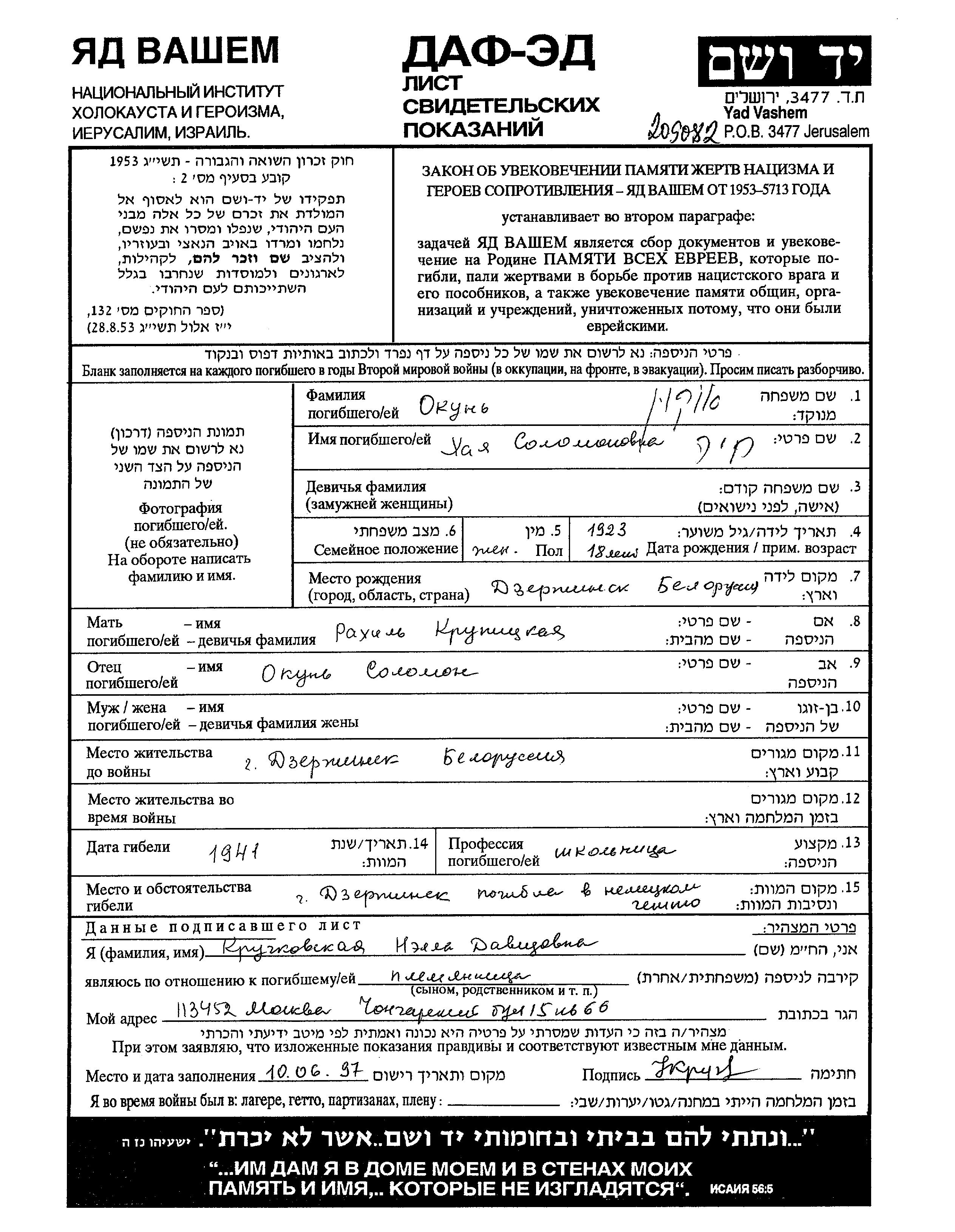 Okun Khaia 1923 Dzerzhinsk, Bélorussie (URSS) Feuille de témoignage