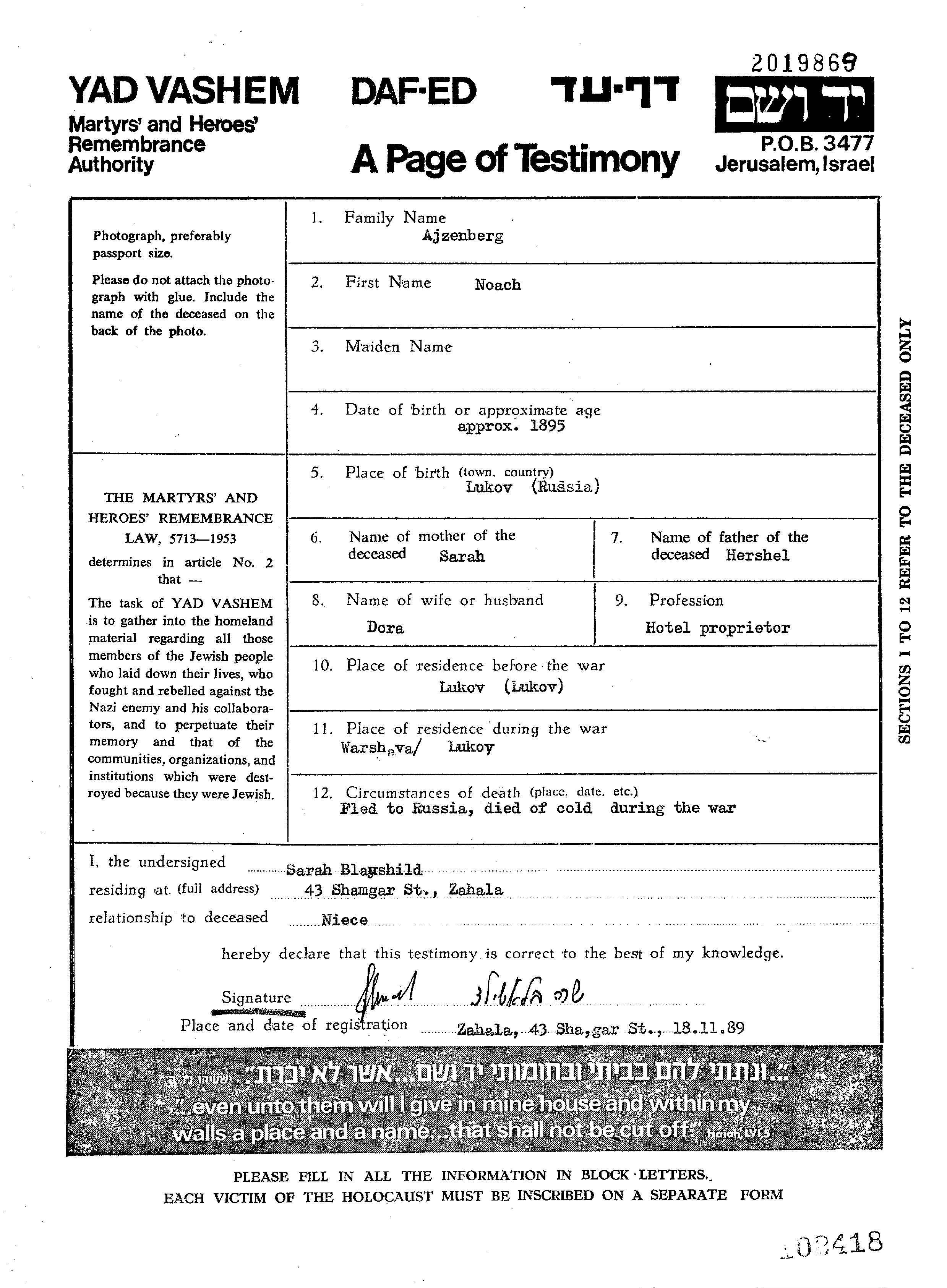 Ajzenberg Noach 1895 Lukow, Pologne Feuille de témoignage