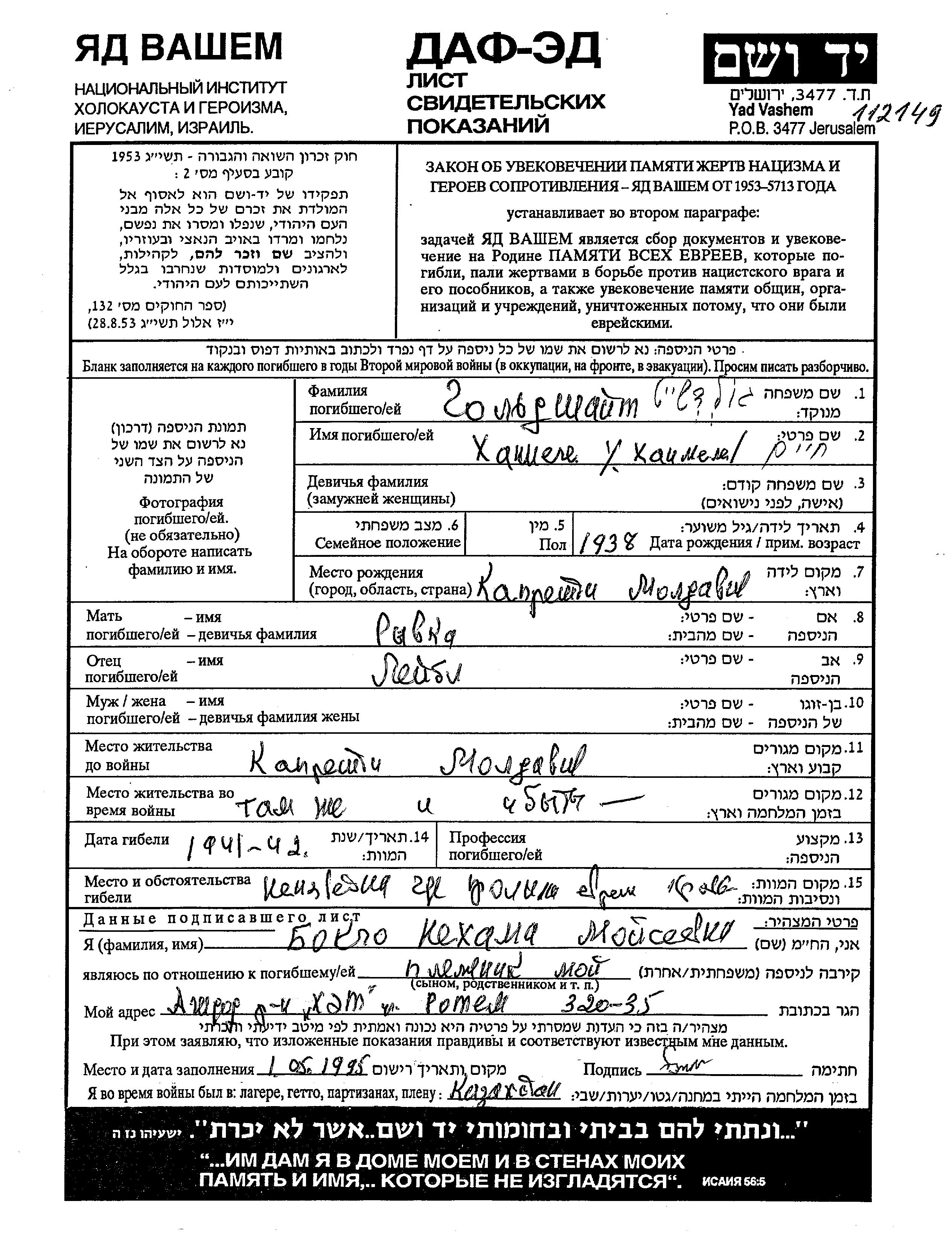 Yad Vashem - Pages of Testimony Names Memorial Collection