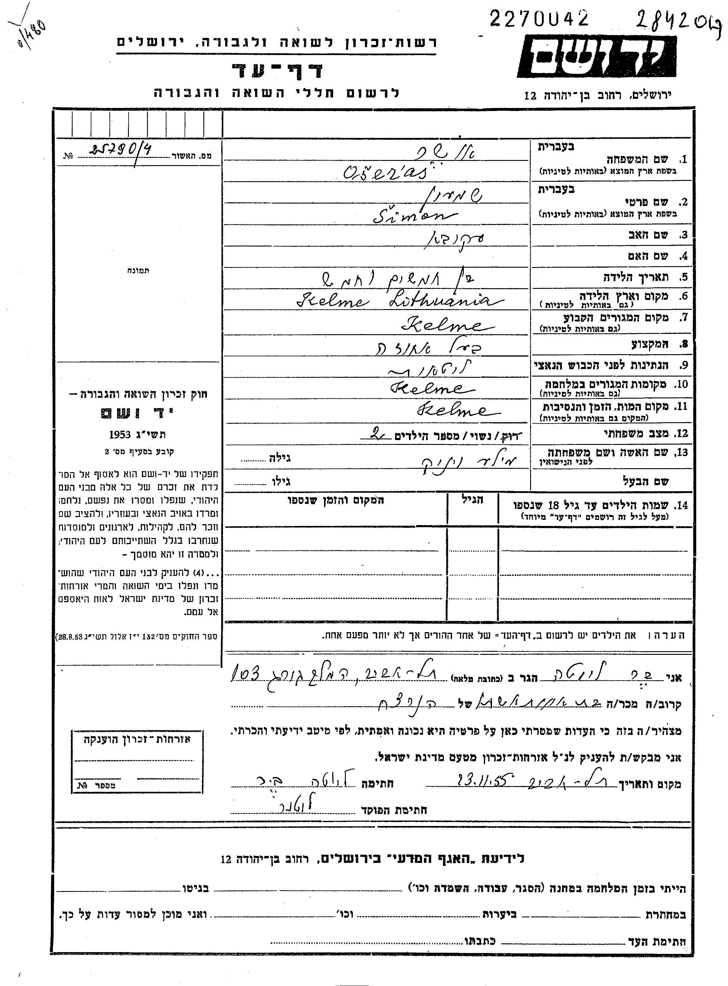Oser Simon Kelmė, Lituanie Feuille de témoignage