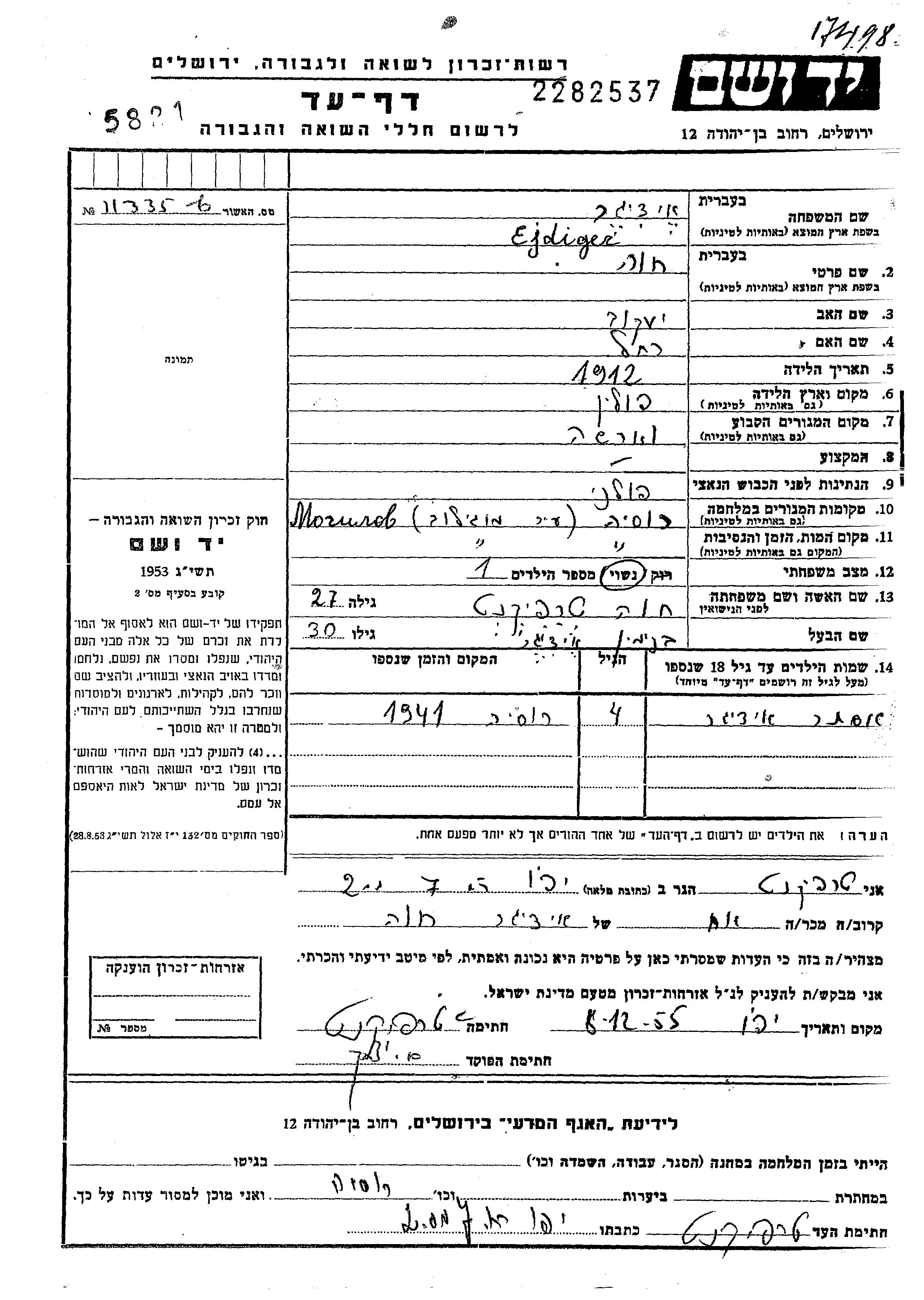 Ejdiger Khava 1912 Warszawa, Pologne Feuille de témoignage