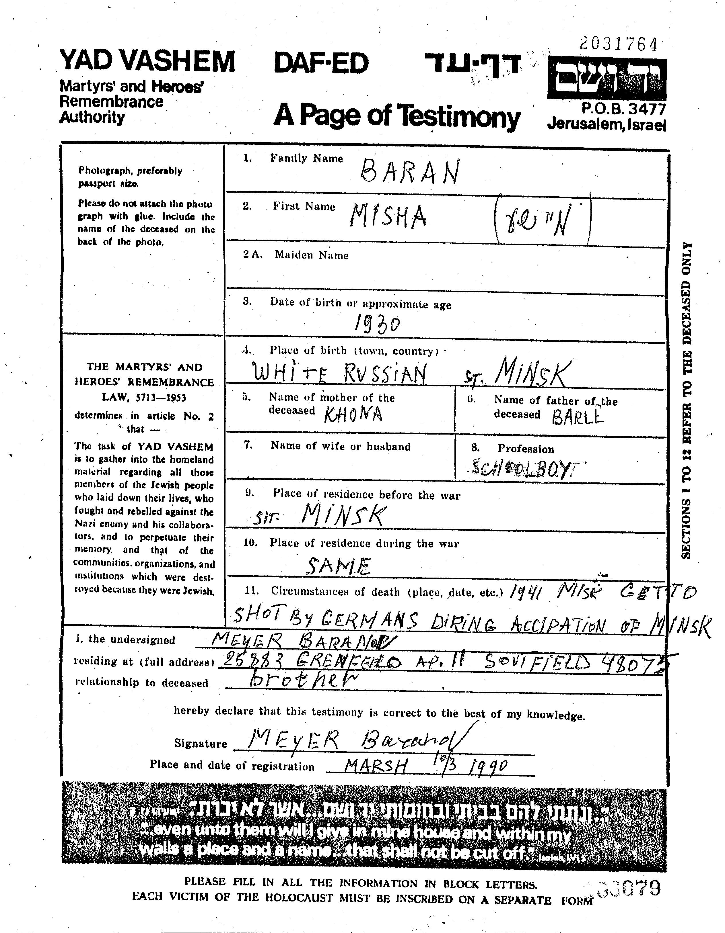 Baran Misha 1930 Minsk, Bélorussie (URSS) Feuille de témoignage