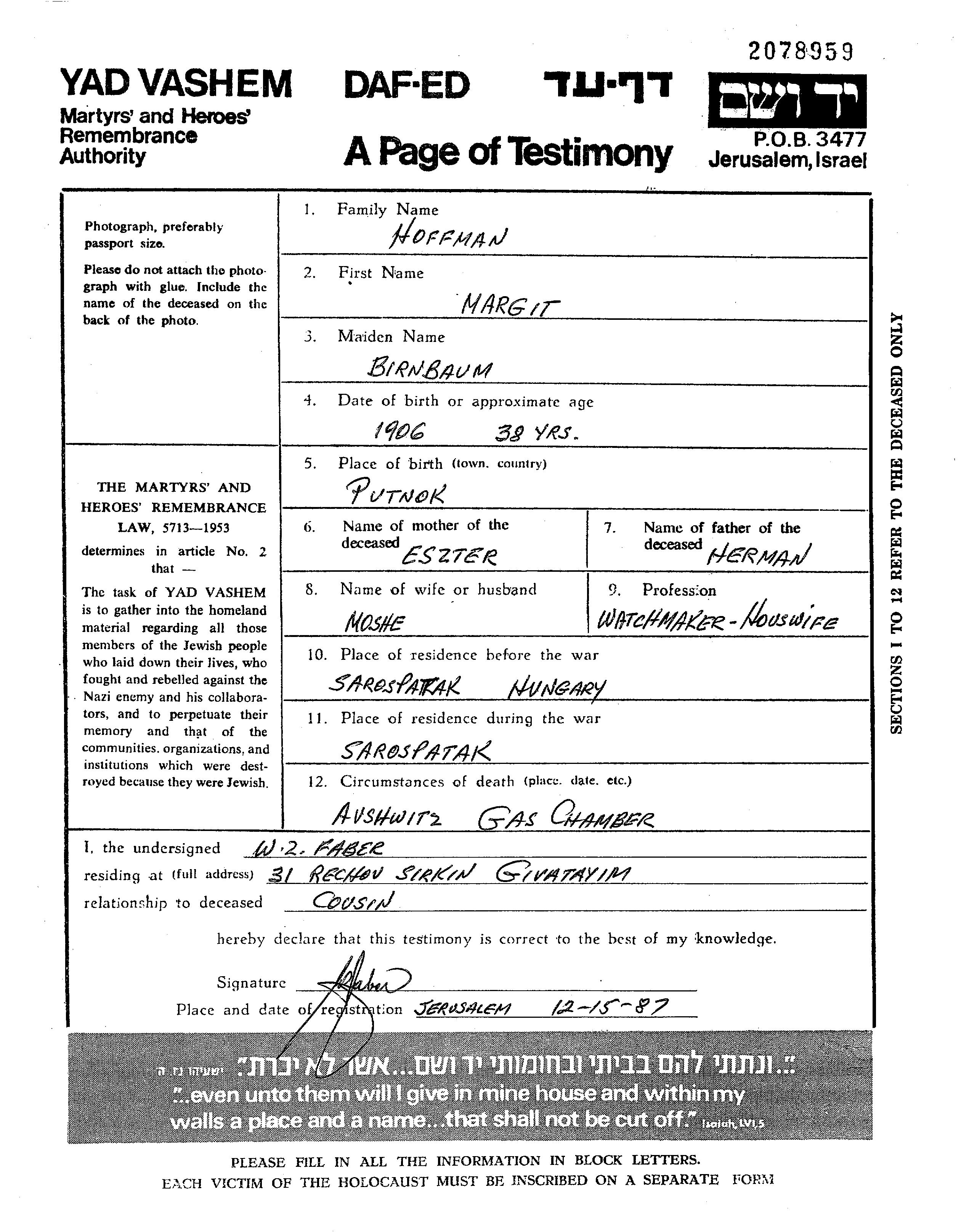 Hoffman Margit Sarospatak, Hongrie Feuille de témoignage