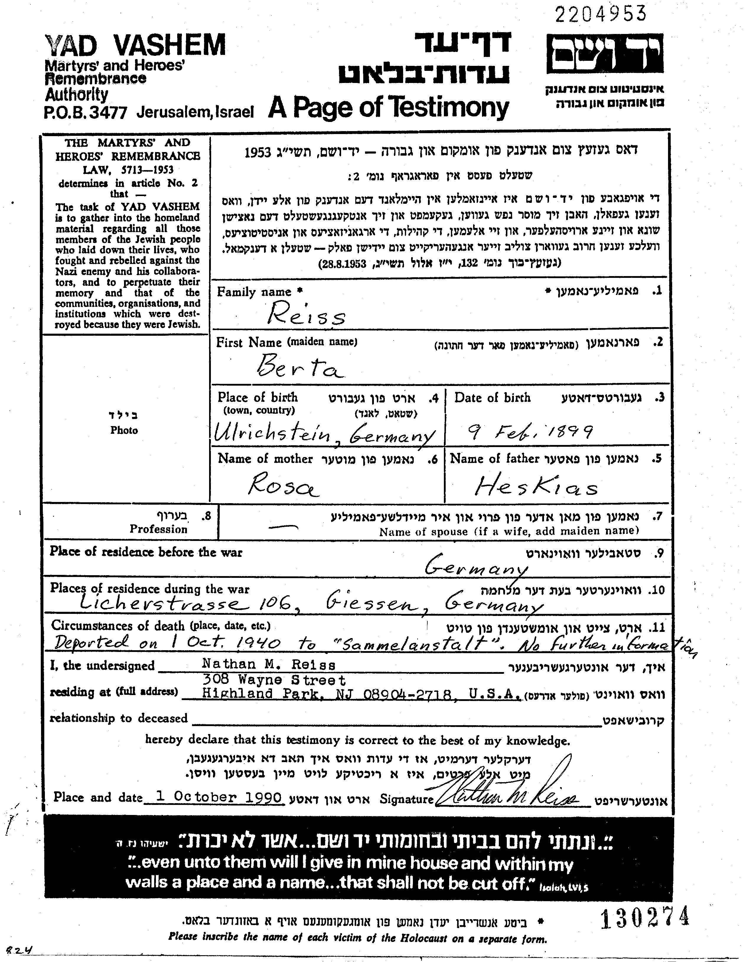 Berta Reiss est née à Ulrichstein, Allemagne en 1899, fille de Heskias Khizkiahu et de Rosa. Avant la seconde guerre mondiale elle vivait à Allemagne. Pendant la guerre, elle était à Giessen, Allemagne.