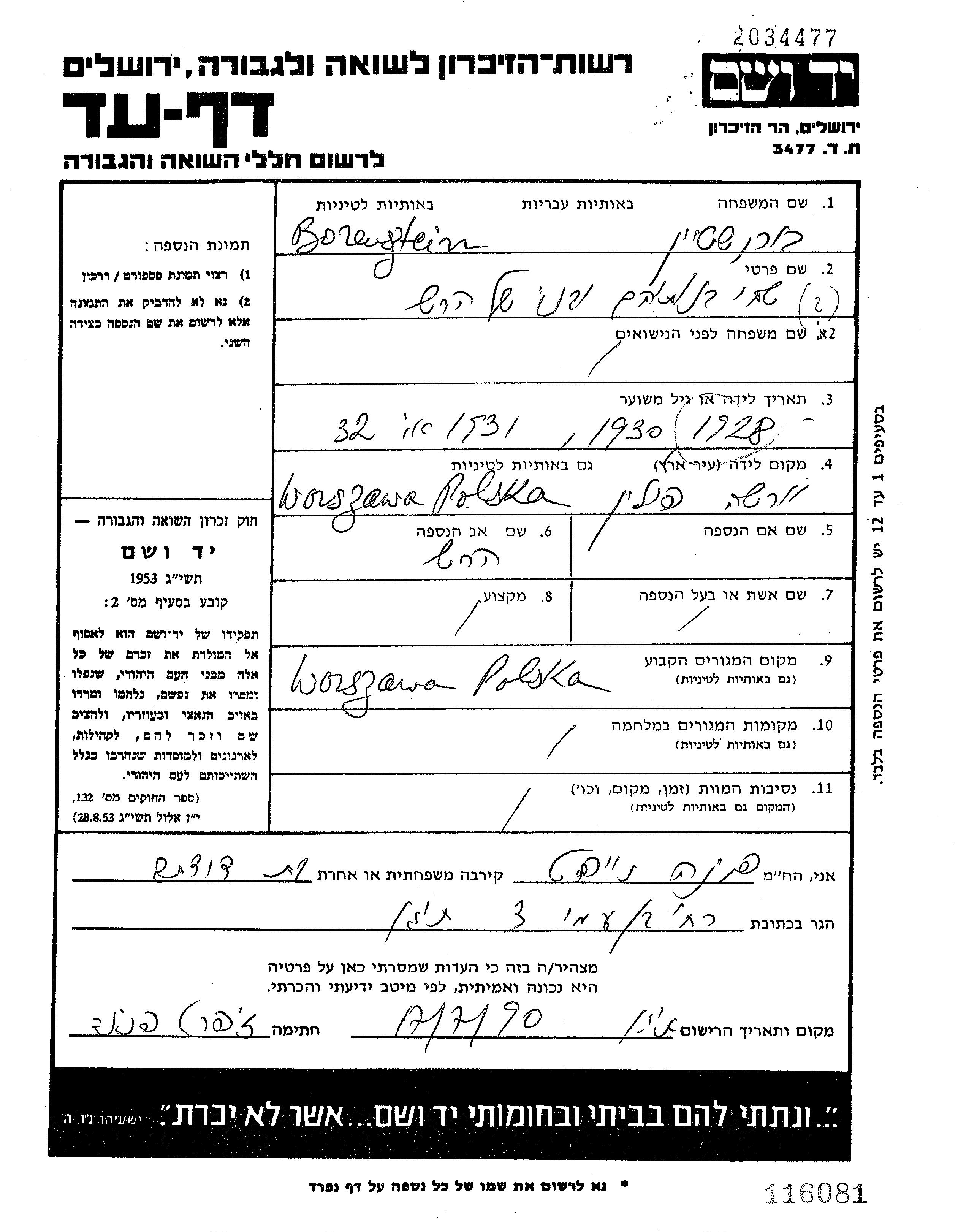 Borenszein prénom inconnu 1928 Warszawa, Pologne Feuille de témoignage
