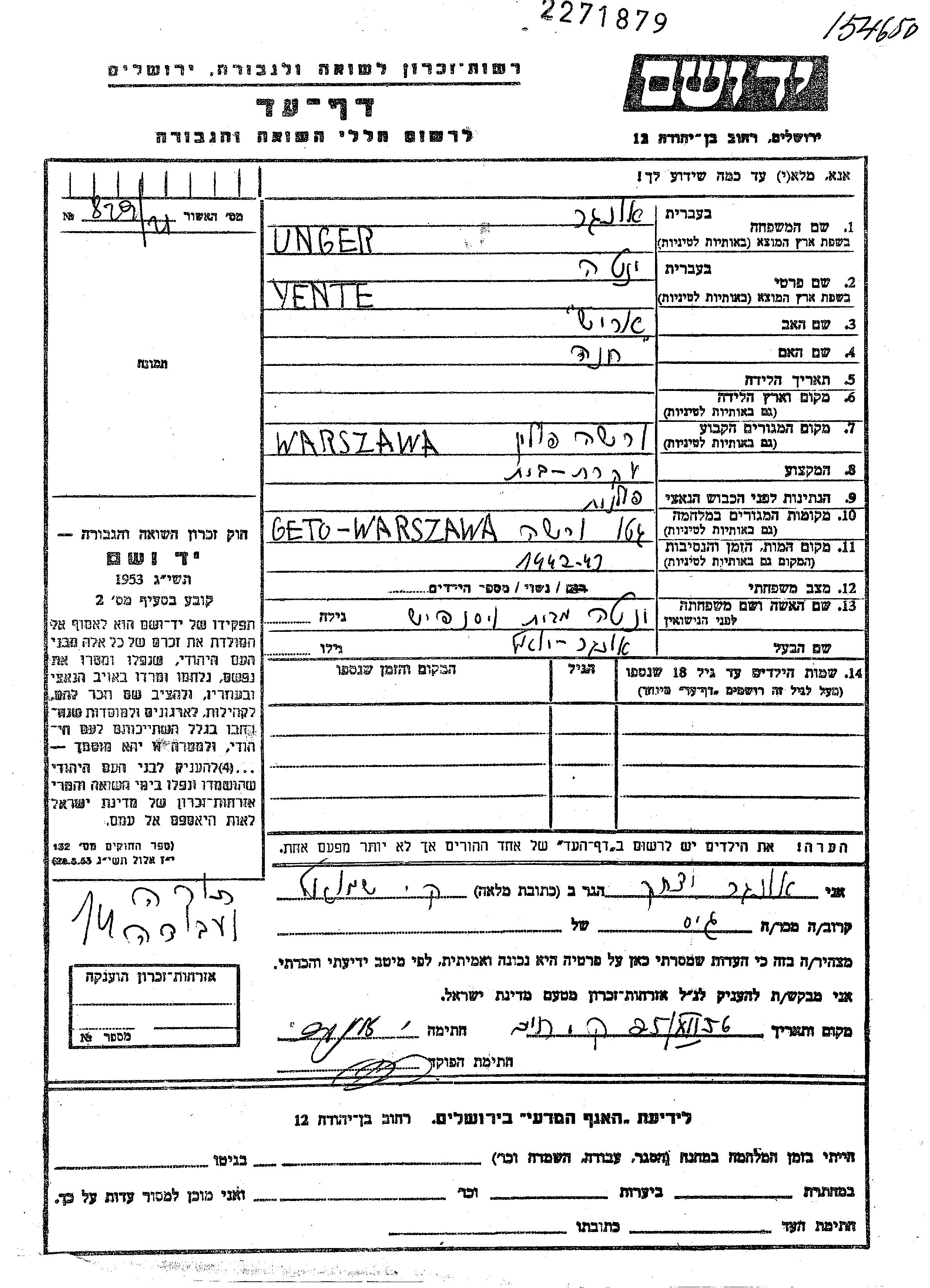 Unger Yente Warszawa, Pologne Feuille de témoignage