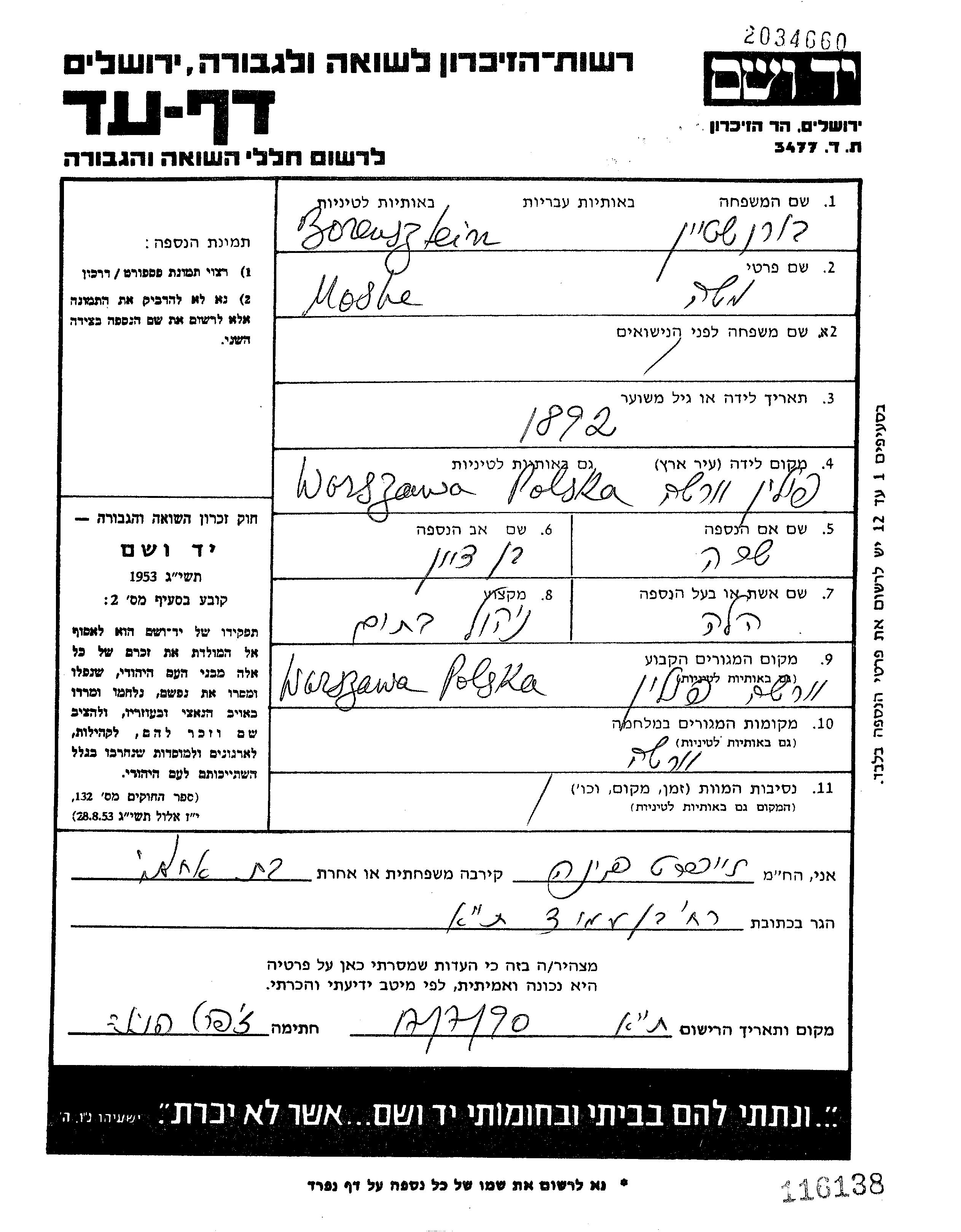 Borensztein Moshe 1892 Warszawa, Pologne Feuille de témoignage