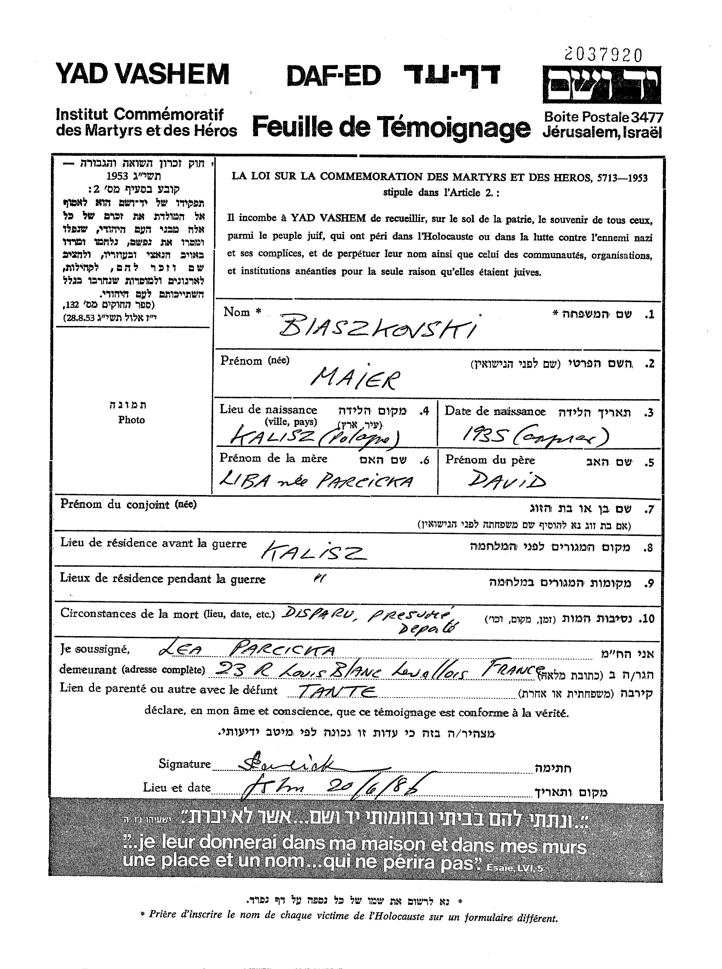Maier Biaszkovski est né à Kalisz, Pologne en 1935, fils de David et de Liba née Parcicka. Il était Enfant. Avant la seconde guerre mondiale il vivait à Kalisz, Pologne. Au cours de la guerre, il était à Kalisz, Pologne.