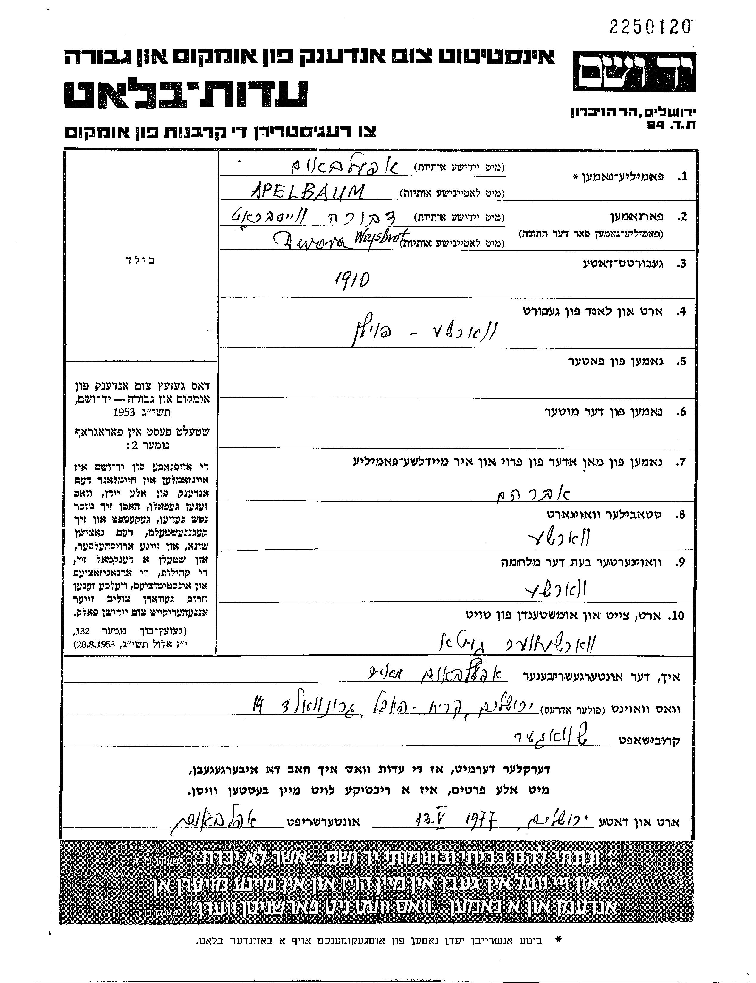 Apelbaum Dwora 1910 Warszawa, Pologne Feuille de témoignage