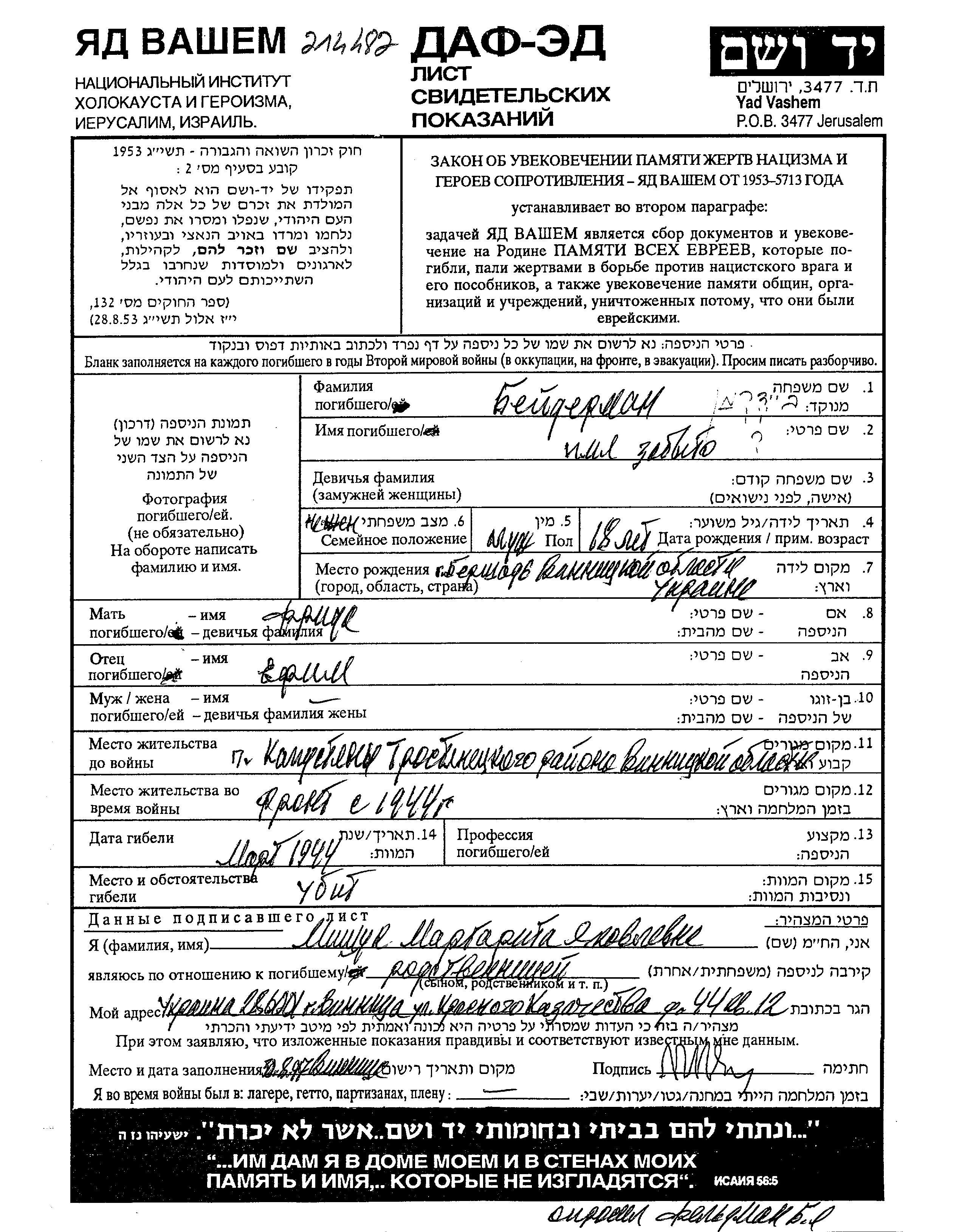 prénom inconnu Beiderman est né à Bershad, Ukraine (URSS) en 1926, fils de Yefim et de Frida née Altshtein. Il était Célibataire. Avant la seconde guerre mondiale il vivait à Kapustyany, Ukraine (URSS). Au cours de la guerre, il était à the Soviet armed forces. Il a été tué en tant que militaire pendant la Seconde Guerre mondiale. Lieu de la mort: endroit inconnu en 1944.