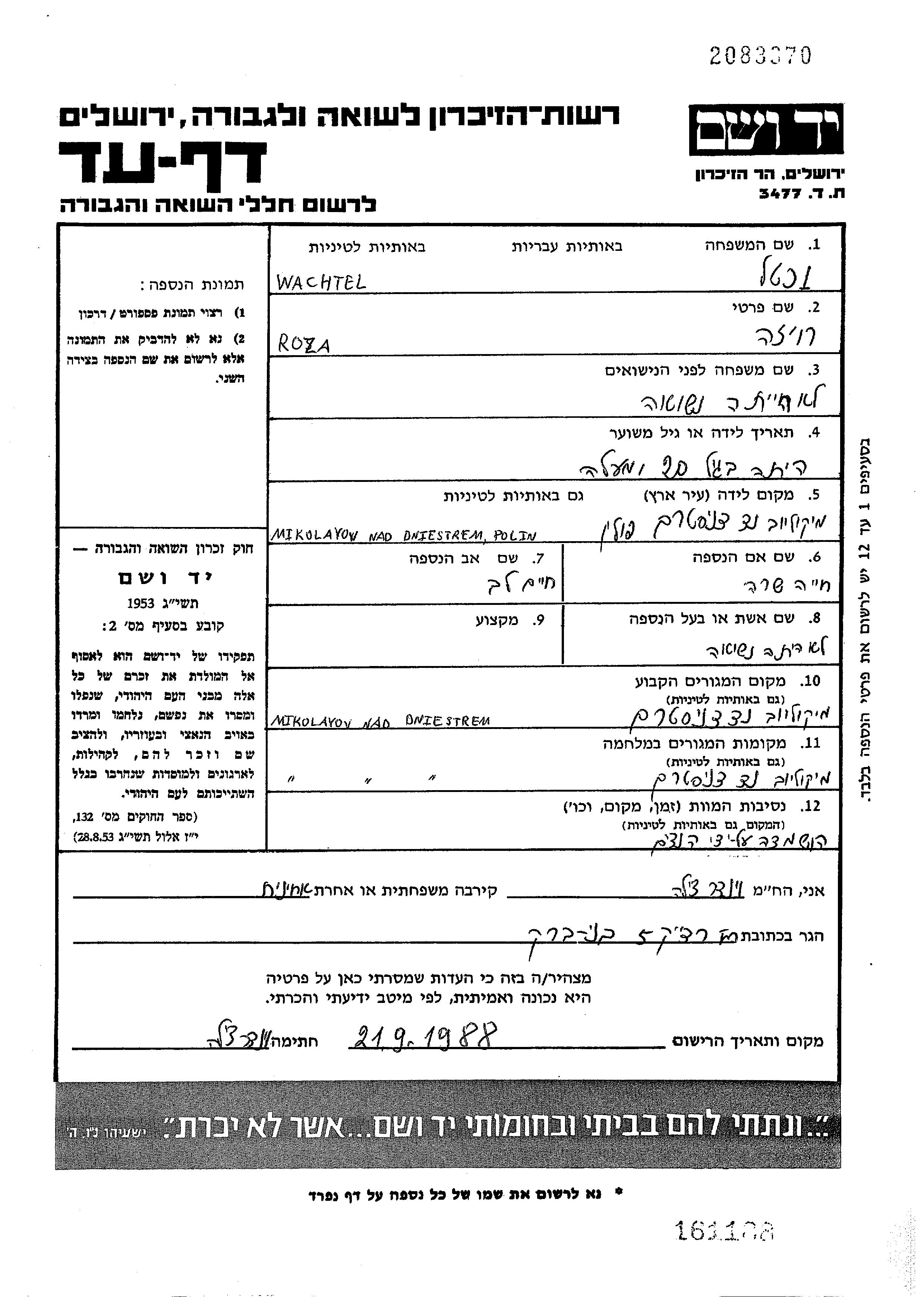 Wachtel Roiza Mikolajow nad Dniestrem, Pologne Feuille de témoignage