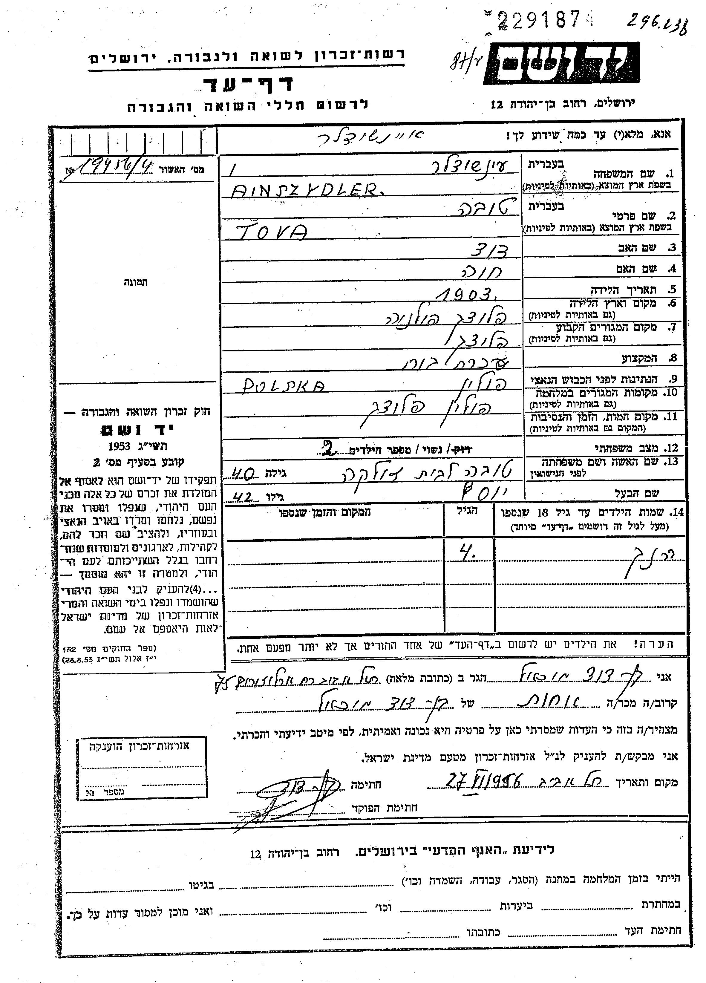 Ainszydler Einshidler Tova 1903 Plock, Pologne Feuille de témoignage