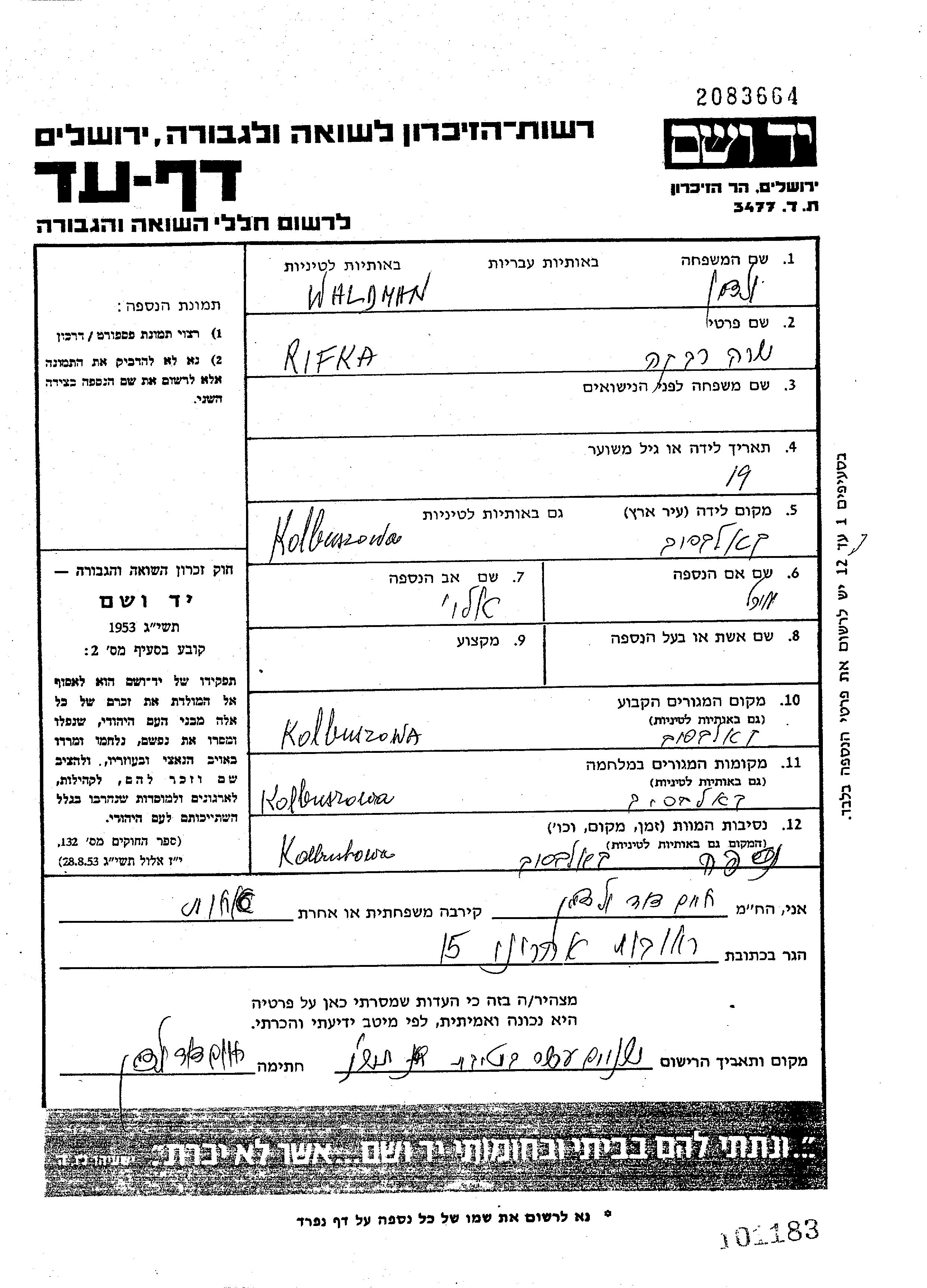 Waldman Rivka Sara Kolbuszowa, Pologne Feuille de témoignage