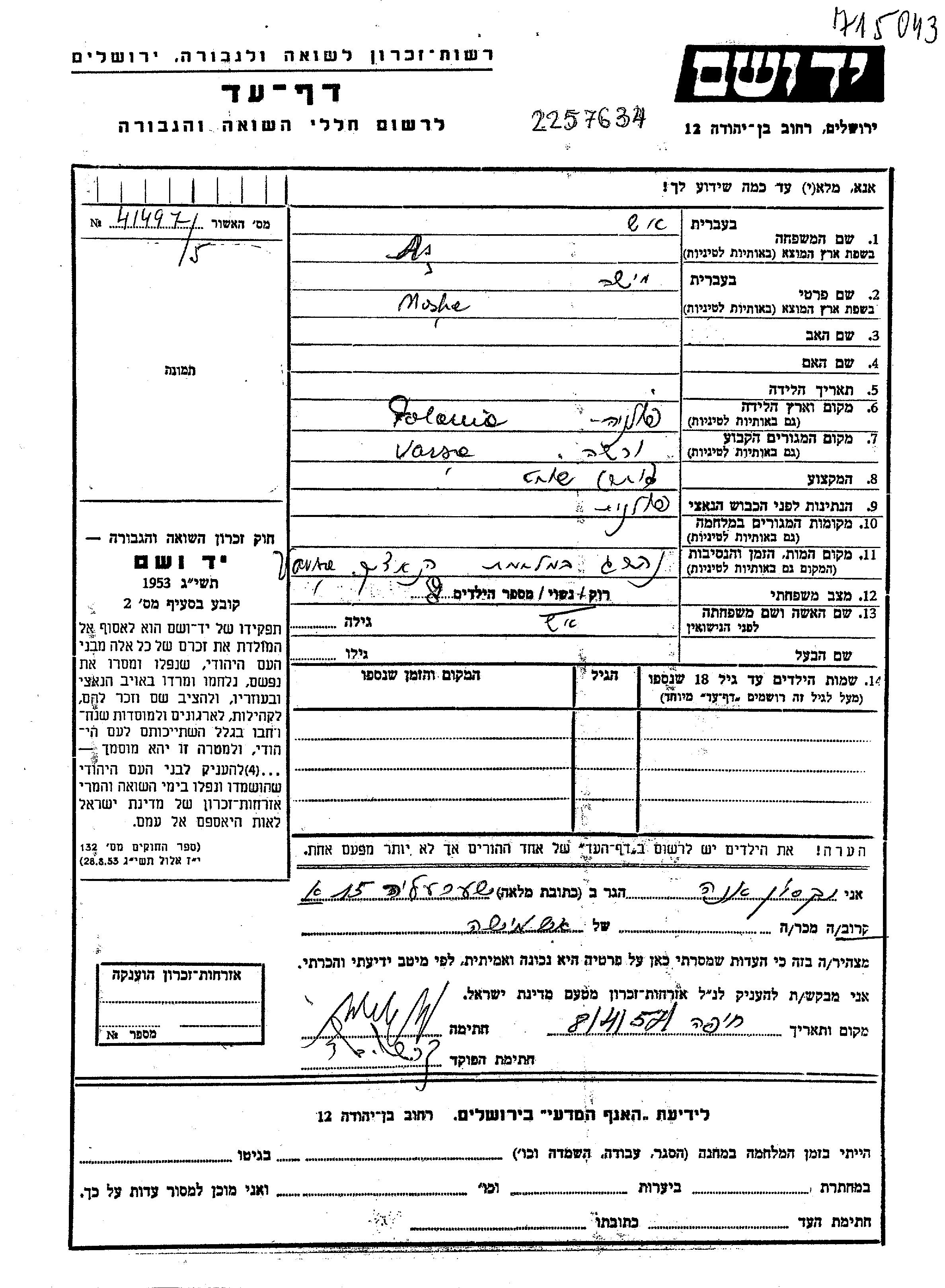 As Moshe Warszawa, Pologne Feuille de témoignage